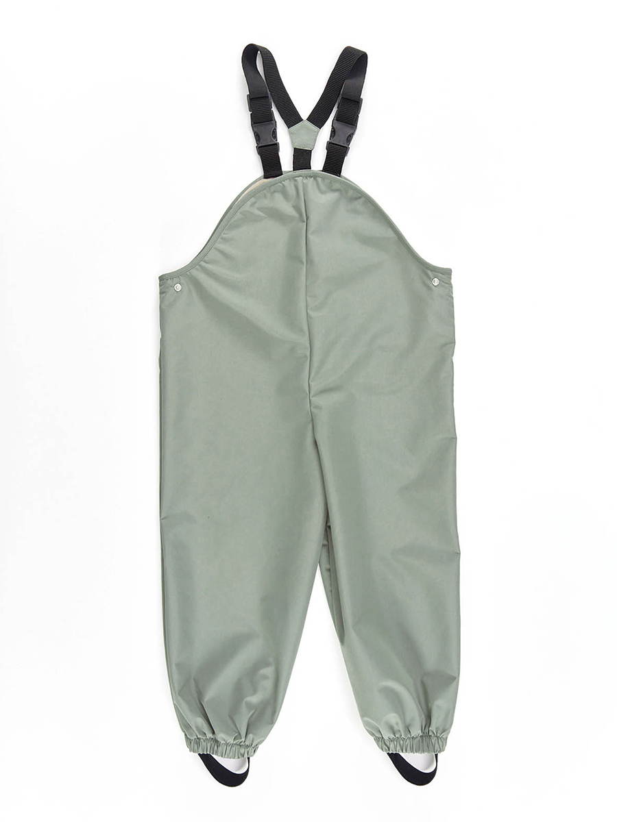 Khaki waterproof puddlesuit gungarees with a digger print on single leg. Adjsutable elastic hangers. Snap fasteners on both sides of the waist.