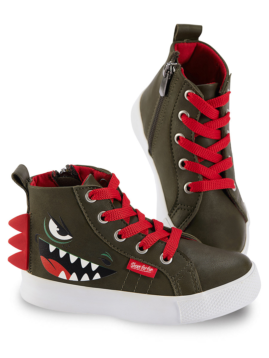 Boy sneakers with a dino print and silicone 3D spikes on single side. Easy to wear on&off due to its zipper on side. Man-made metarial. Upper metairal: 90% PVC, 10%PU. Lining: 85%polyester, 15% cotton. Sole: Thermo PVC