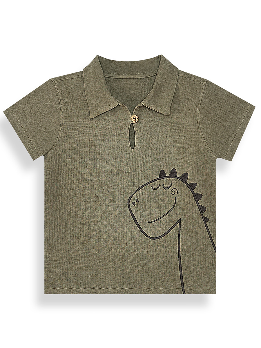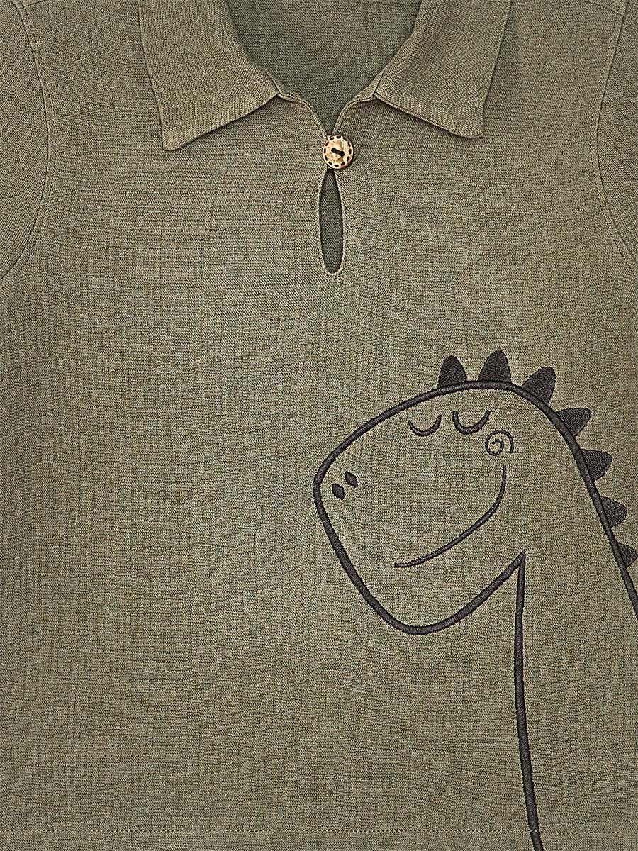 2 parça takım. Muslin kumaştan, haki renk, yakalı gömlek. Üzerinde sevimli bi dinozor nakışı vardır. Muslin kumaştan şort. Bir yanında 3 boyutlu dinozor tırtırı vardır. Beli lastik ve kordonludur. Tüm Denokids ürünleri çocuk güvenlik kurallarına uygun üretilmekte ve tek tek iğne dedektörlerinden geçmektedir.