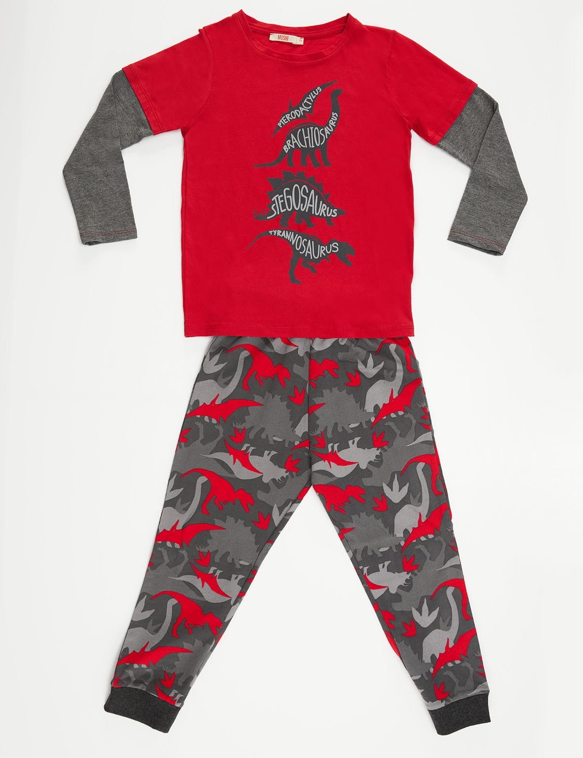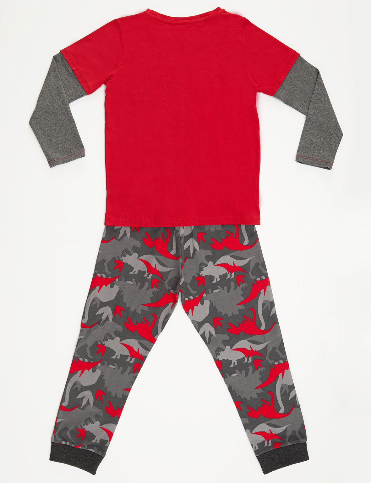 2 piece boy set. Cotton jersey t-shirt designed like it is worn on top of each other. The set is completed with a dino camo, cotton sweat-pants. top %92 cotton %8 elastane bottom;%100 cotton