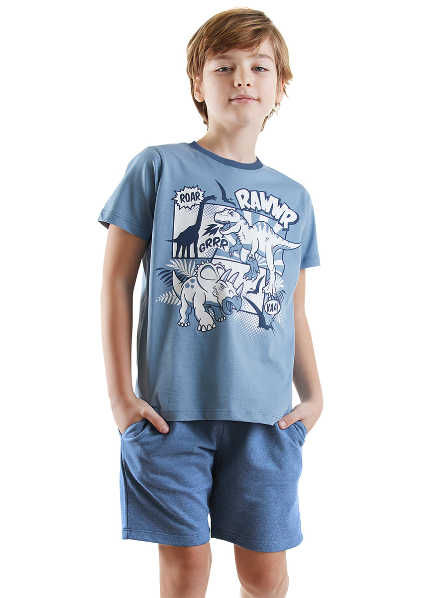 2 piece set. 100% Cotton jersey, short sleeve, round neck t-shirt. Has dinosaurs print on. The navy blue shorts is made of recycled fabric. Has 2 side pockets. Elasticated waistband and drawstrings. All Denokids Products are manufactured wi