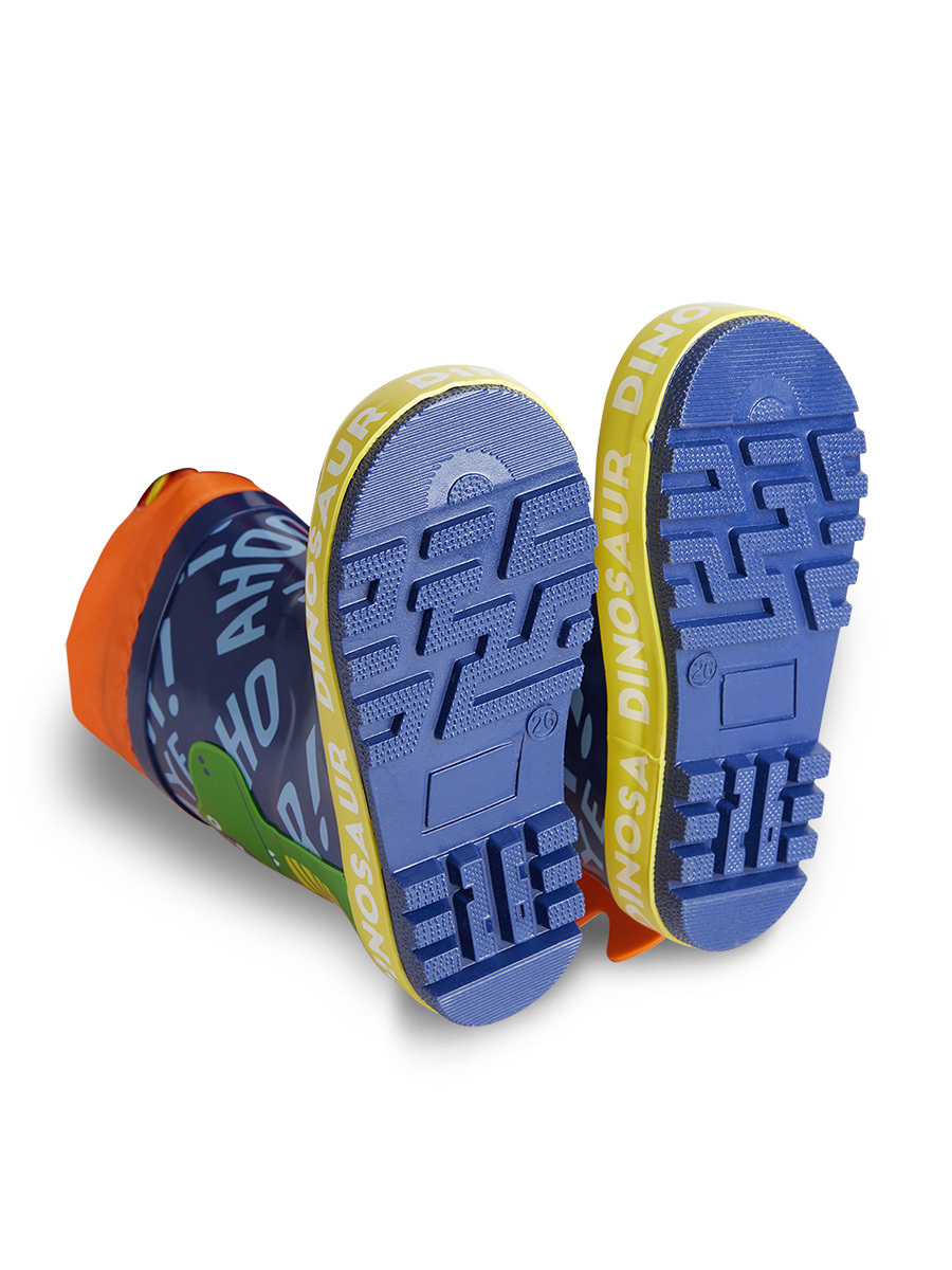 Wateproof rain boots with a dinosaur print on. The spikes of the dinosaur is 3D. There is an adjustment rope on the ankle to prevent water leakage.
