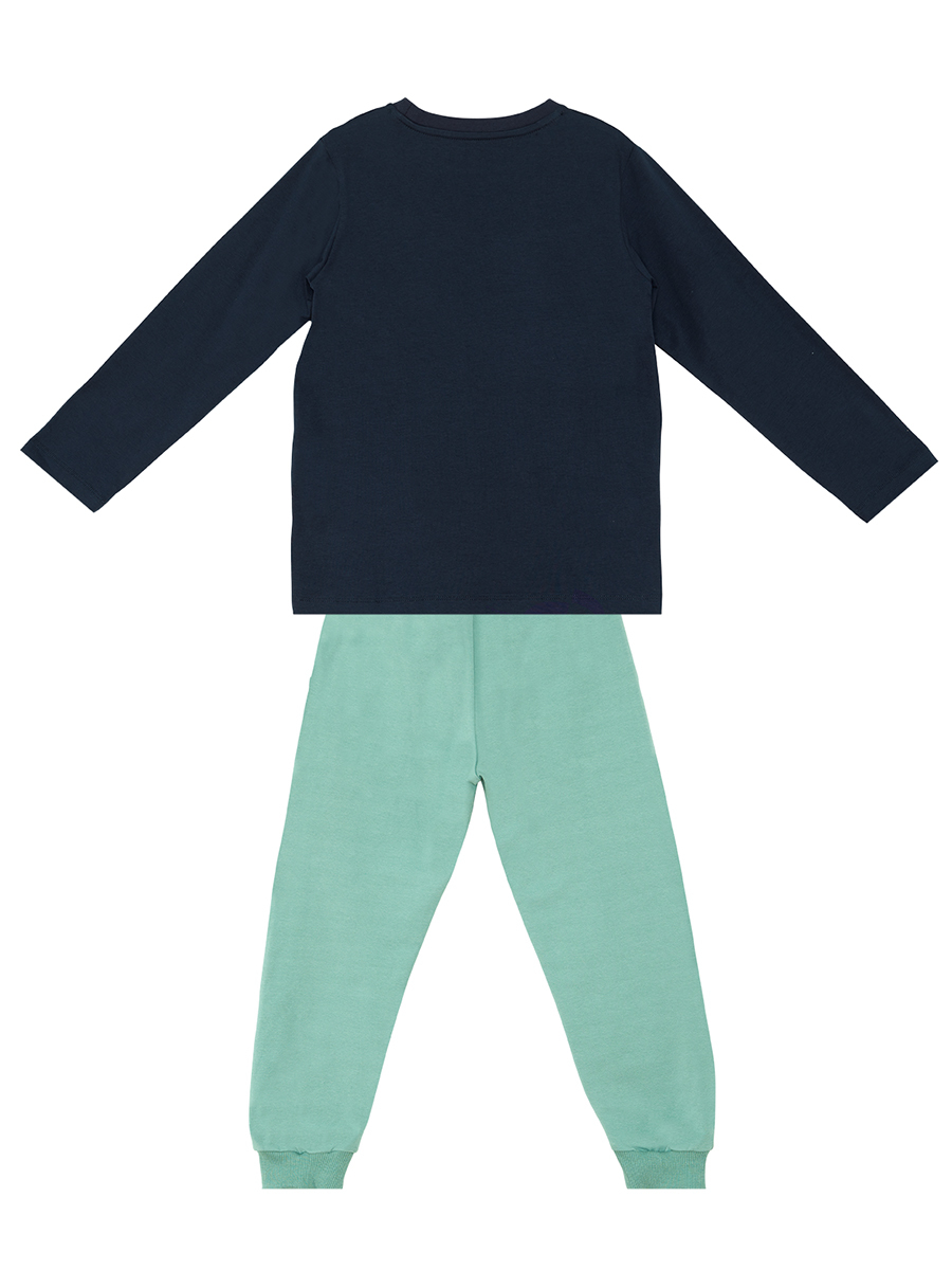2 piece set. Long sleeve, round neck, cotton jersey, navy blue t-shirt. Features a dinosaur print on. The set has a pants made of French Terry cotton. Has 2 side pockets. Elasticated waist and strings. All MSHB&G products are produced withi