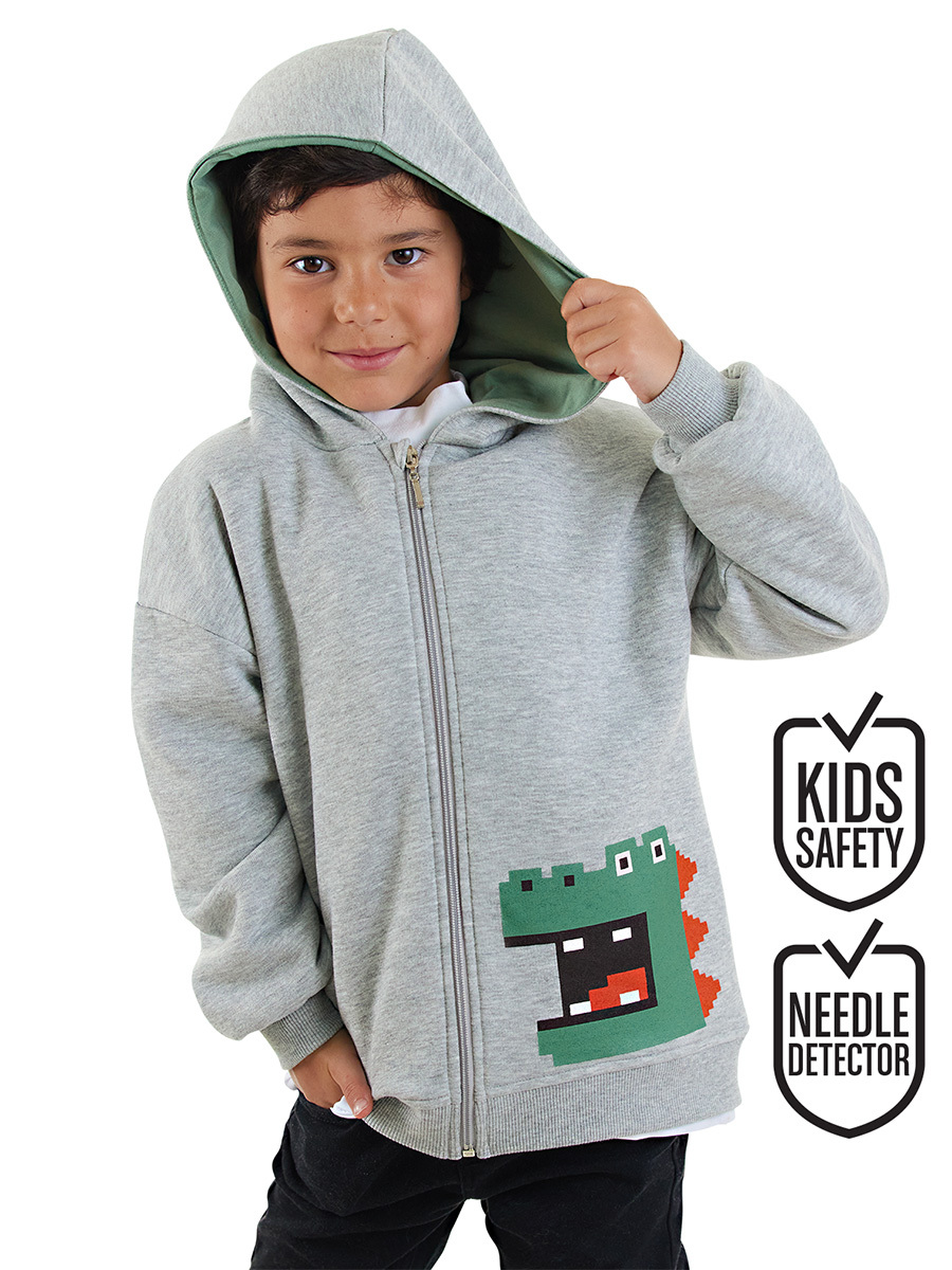 Kalın, şardonlu kumaştan fermuarlı sweatshirt. Uzun kollu ve kapüşonludur. Üzeri dinazor baskılıdır. Tüm Denokids ürünleri çocuk güvenliği düşünülerek üretilmiştir ve iğne dedektörlerinden geçirilmiştir.
