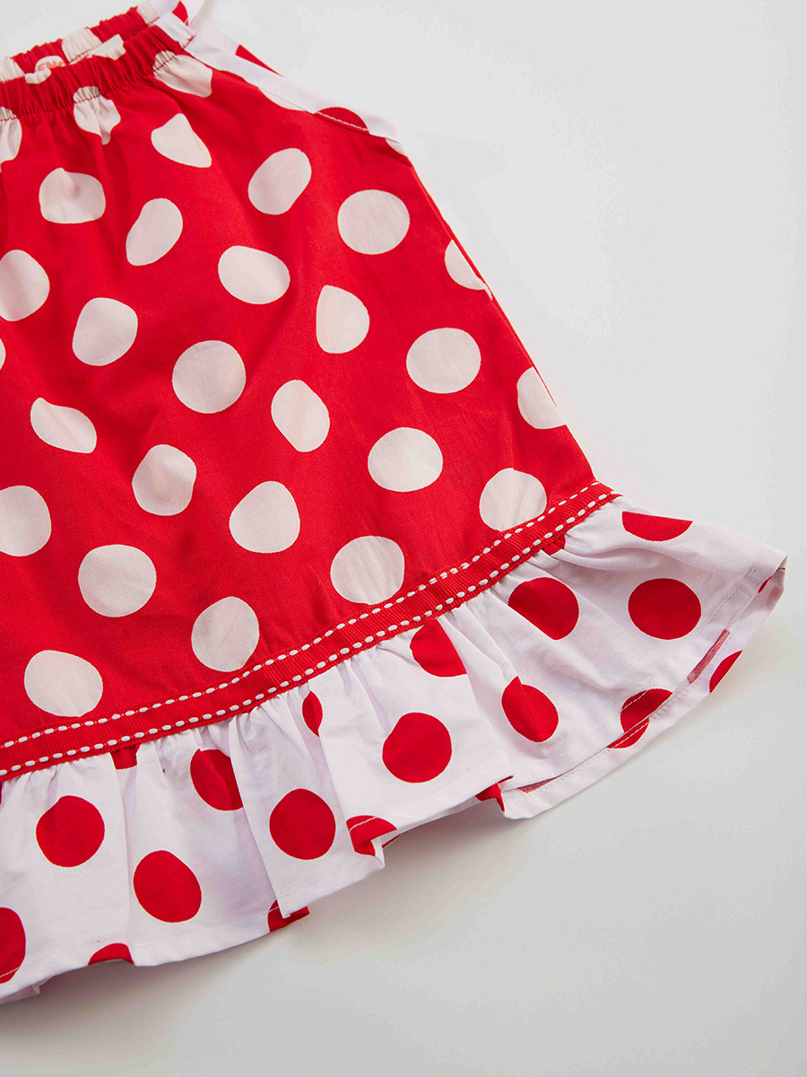 Red dotted baby girl dress made of 100% cotton poplin fabric. Has ruffles on skirt. All Denokids Products are manufactured within the Kids Safety Guideline. Has been inspected by metal detectors.