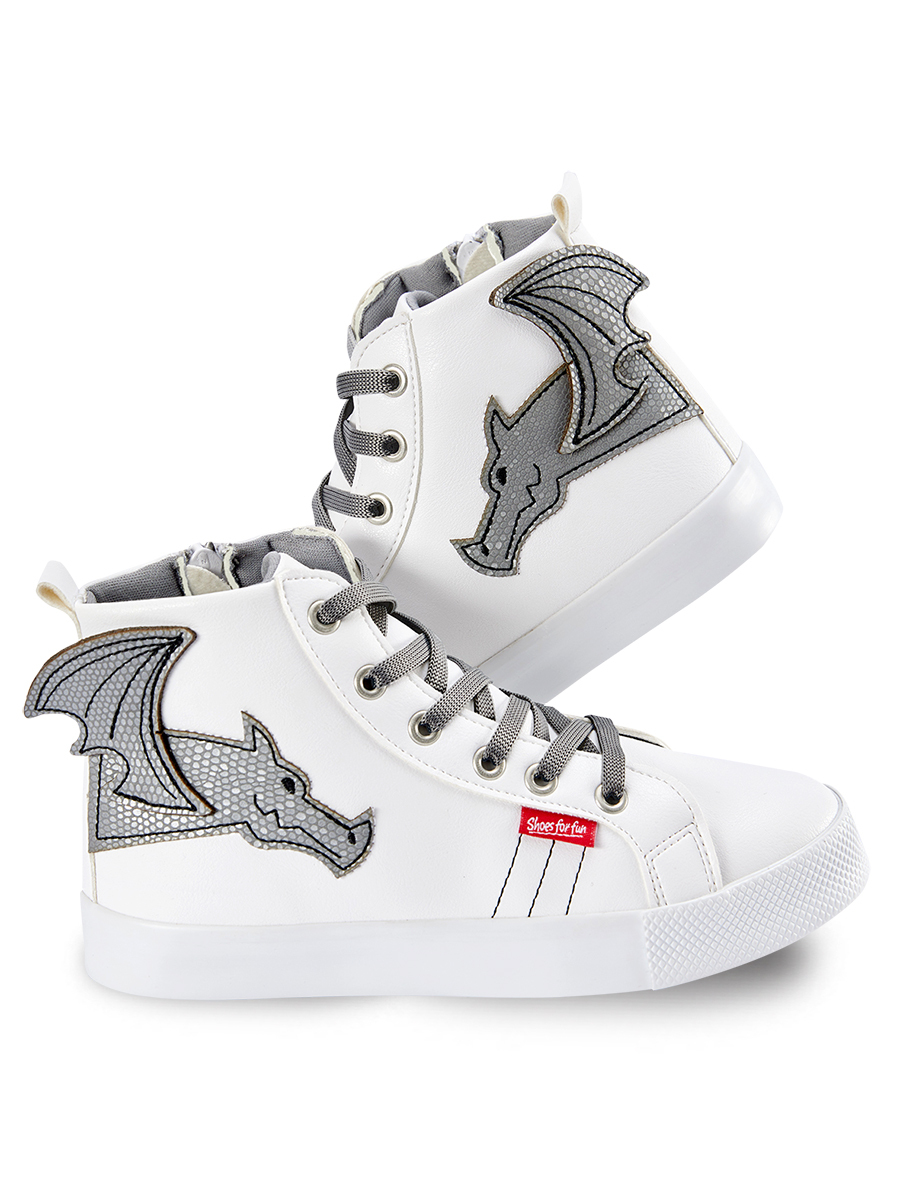 White high top boys sneakers with a dragon applique on single sides. The wing of the dragon is 3D. Man made leather. Wipe clean, do not wash in th WM. Upper metairal: 90% PVC 10% PU, Lining: 85%Polyester 15% Cotton, Sole: Thermo PVC