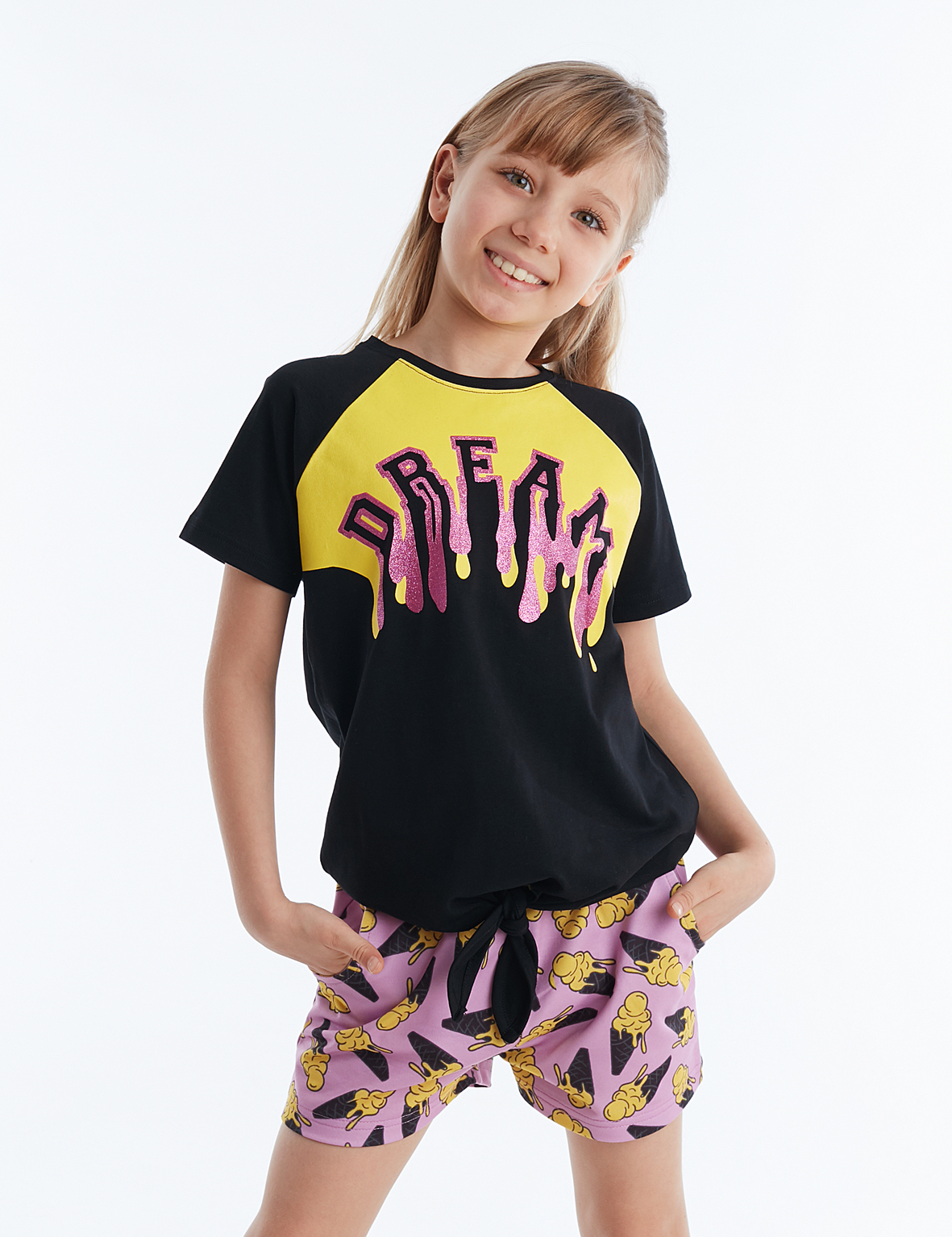 2 piece girl shorts and t-shirt set. Shinny slogan printed tee and ice cream printed shorts. Bottom:%65 Cotton %35 Polyester,Top:%92 Cotton %8 Elasthane