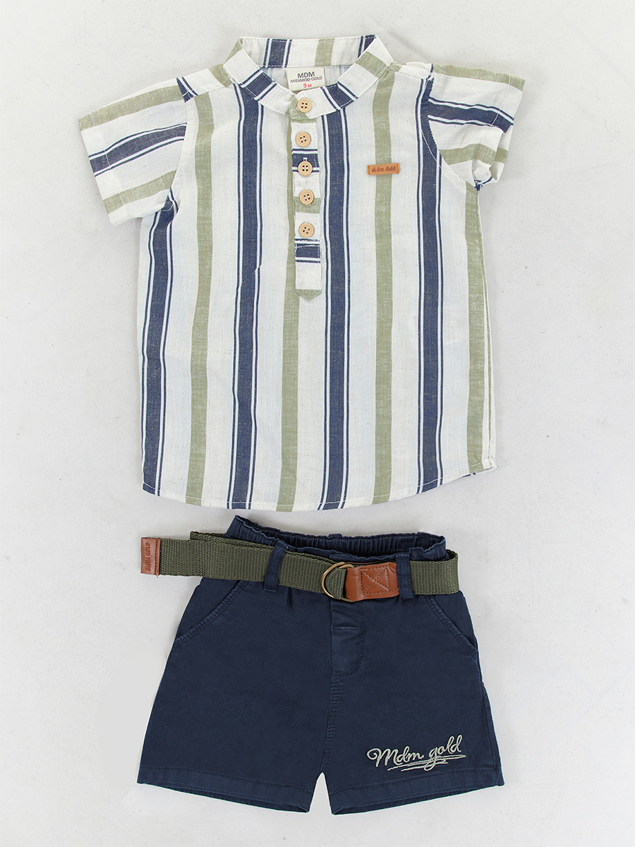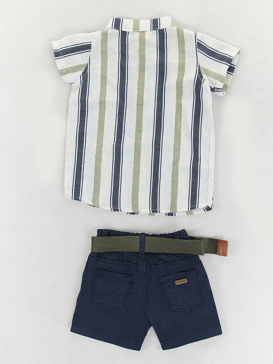 Erkek bebek 3'lü takım. Çizgili dokuma kumaştan hakim yaka kısa kol gömlek. Dokuma gabardin kumaştan şort. 2 yan 2 arka ceplidir. Takıma kemer de dahildir. Üst: %80 Polyester %20 Keten - Alt: %100 Pamuk