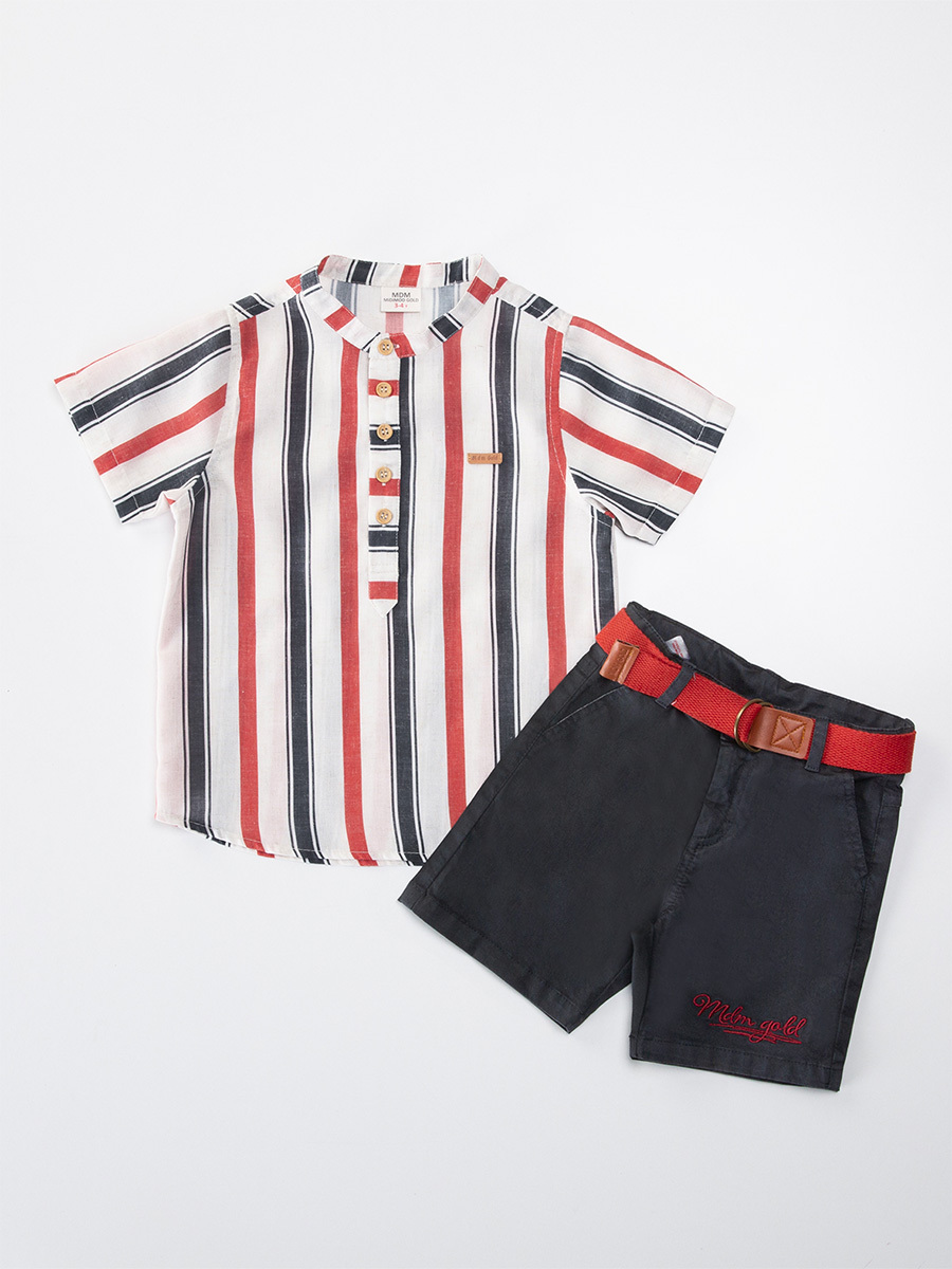 Erkek bebek 3'lü takım. Çizgili dokuma kumaştan hakim yaka kısa kol gömlek. Dokuma gabardin kumaştan şort. 2 yan 2 arka ceplidir. Takıma kemer de dahildir. Üst: %80 Polyester %20 Keten - Alt: %100 Pamuk