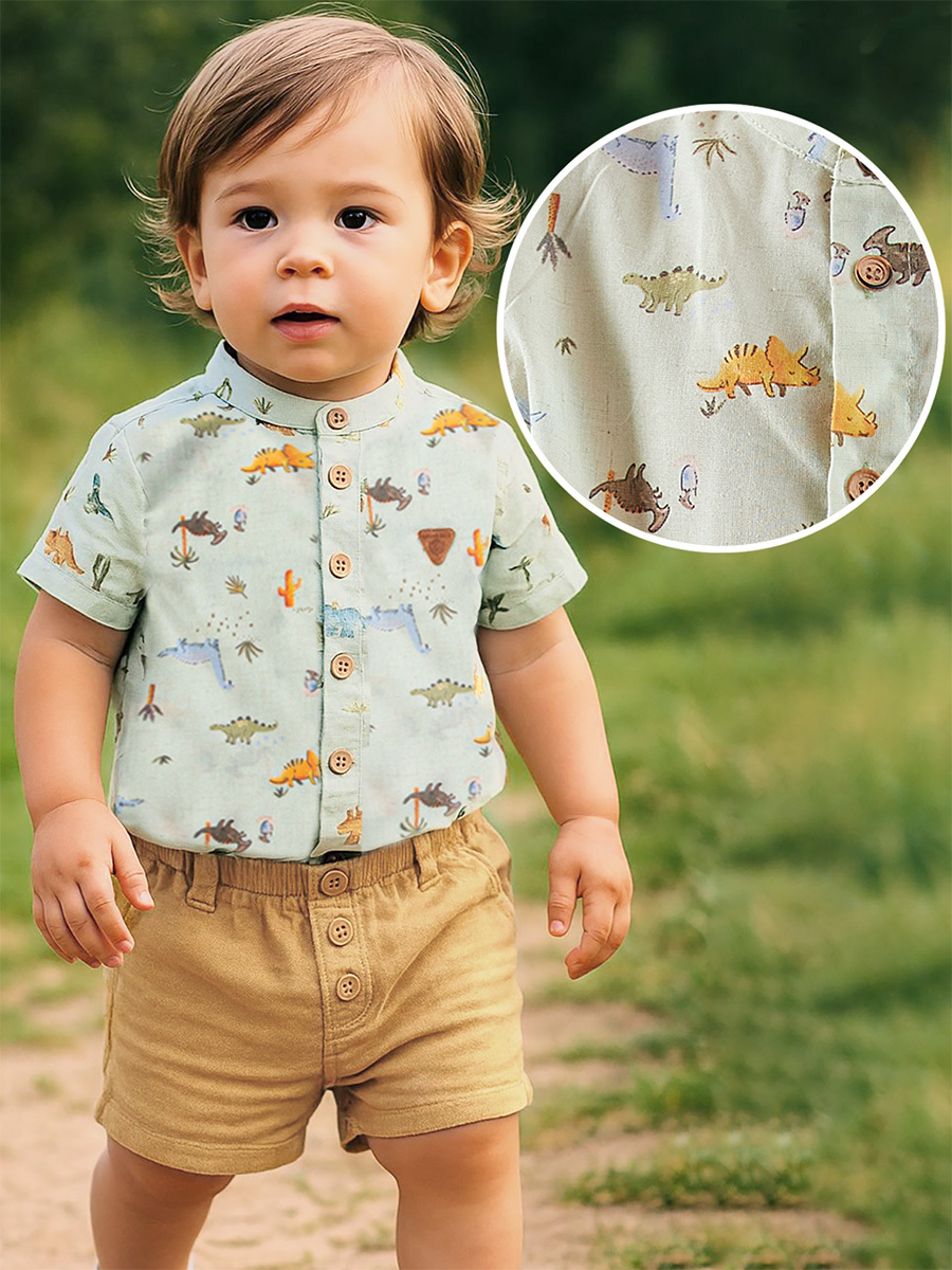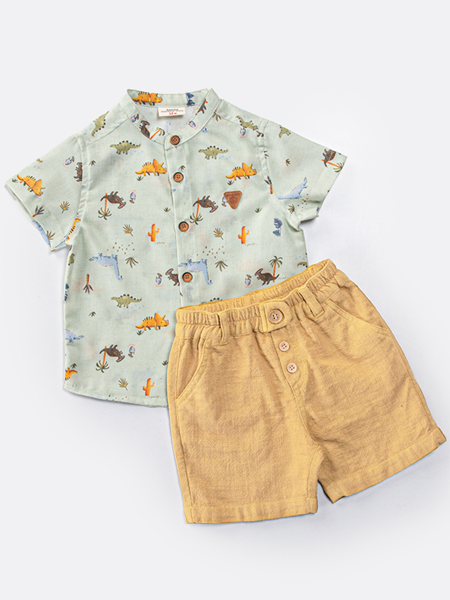 Erkek bebek bayramlık takım. Dinozor desenli dokuma kumaştan hakim yaka kısa kol gömlek. Dokuma müslin kumaştan şort. 2 yan 2 arka ceplidir. Üst: %80 Polyester %20 Keten - Alt: %100 Pamuk