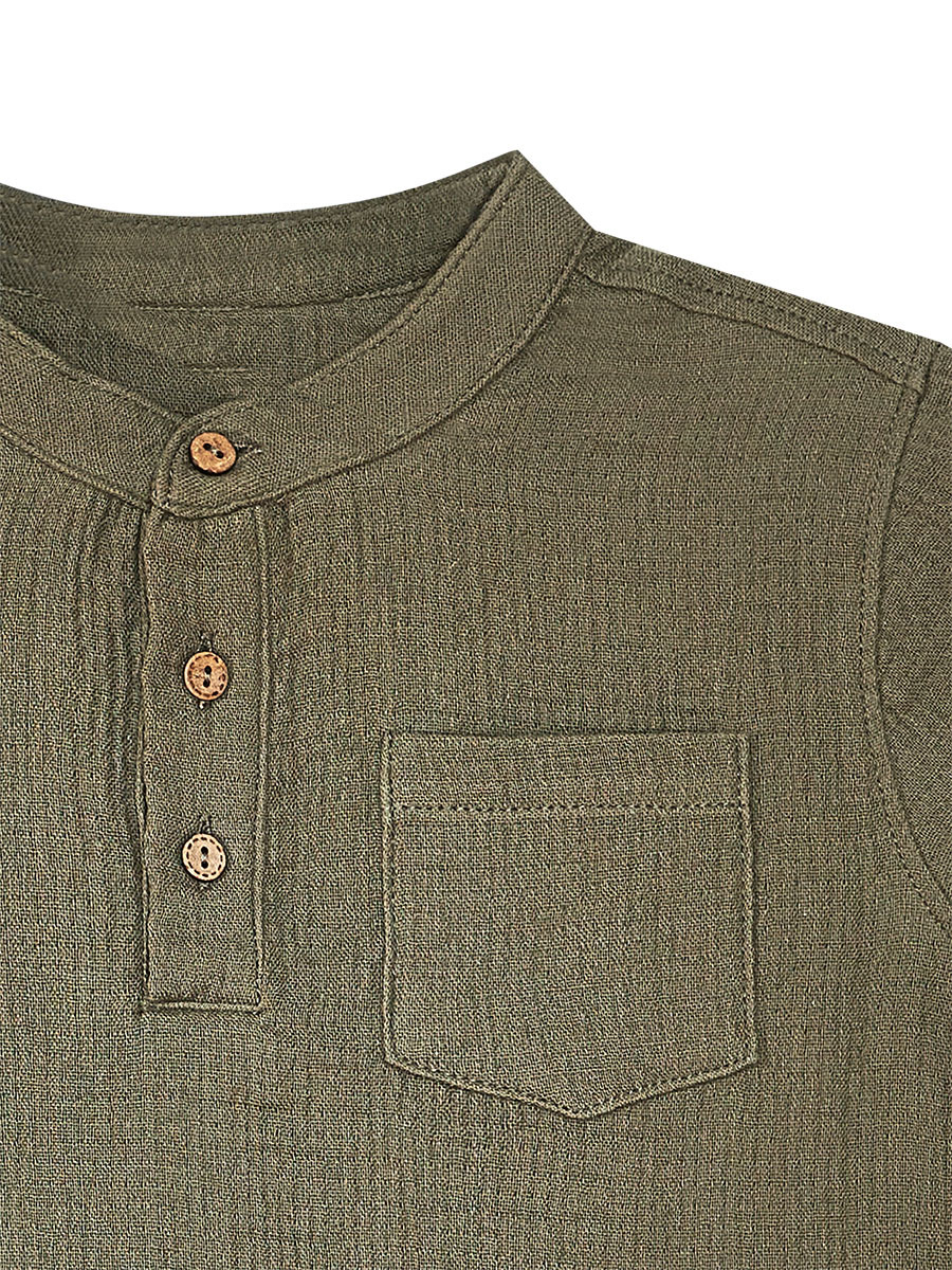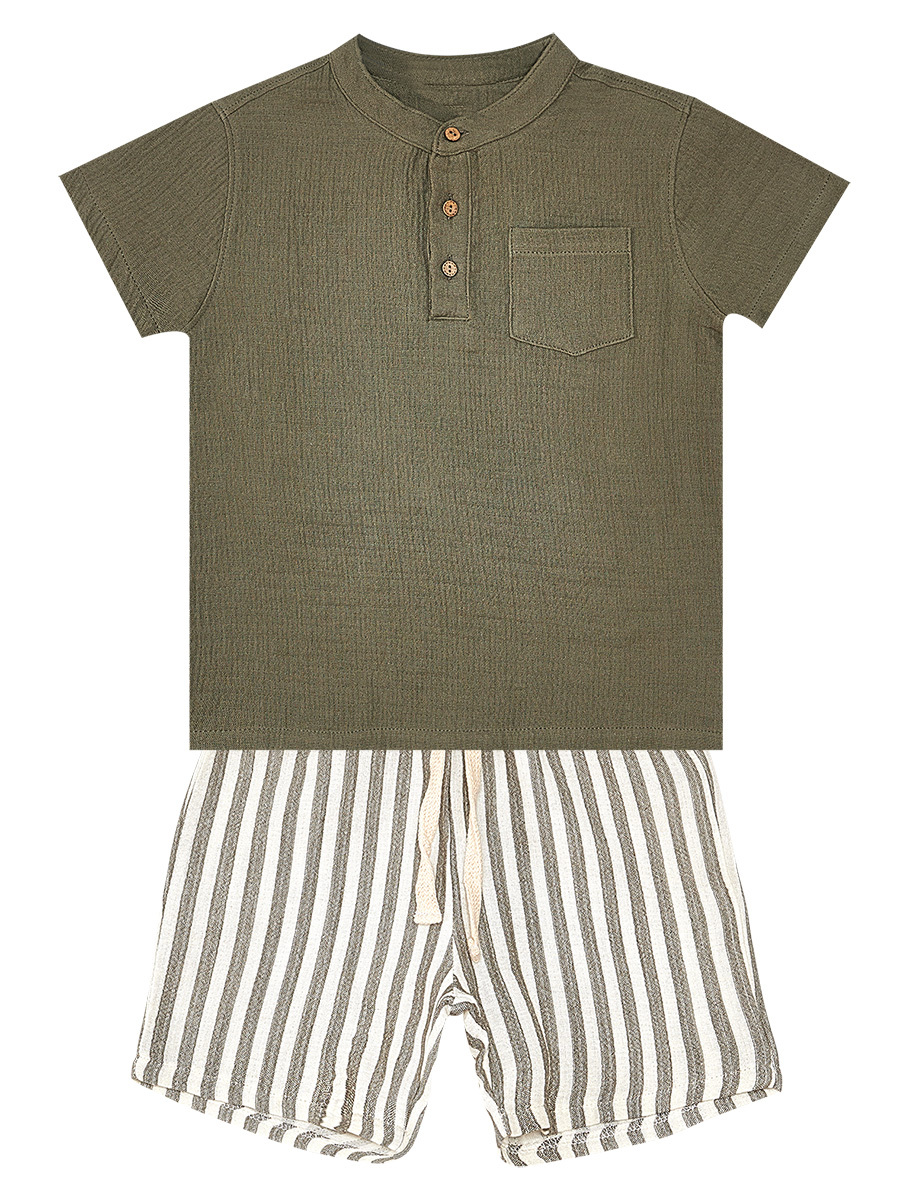 2 parça takım. Muslin kumaştan, hakim yaka gömlek. Tek ceplidir. Çizgili, muslin kumaştan şort. Beli lastik ve kordonludur. Tüm Denokids ürünleri çocuk güvenlik kurallarına uygun üretilmekte ve tek tek iğne dedektörlerinden geçmektedir. %100 Pamuk