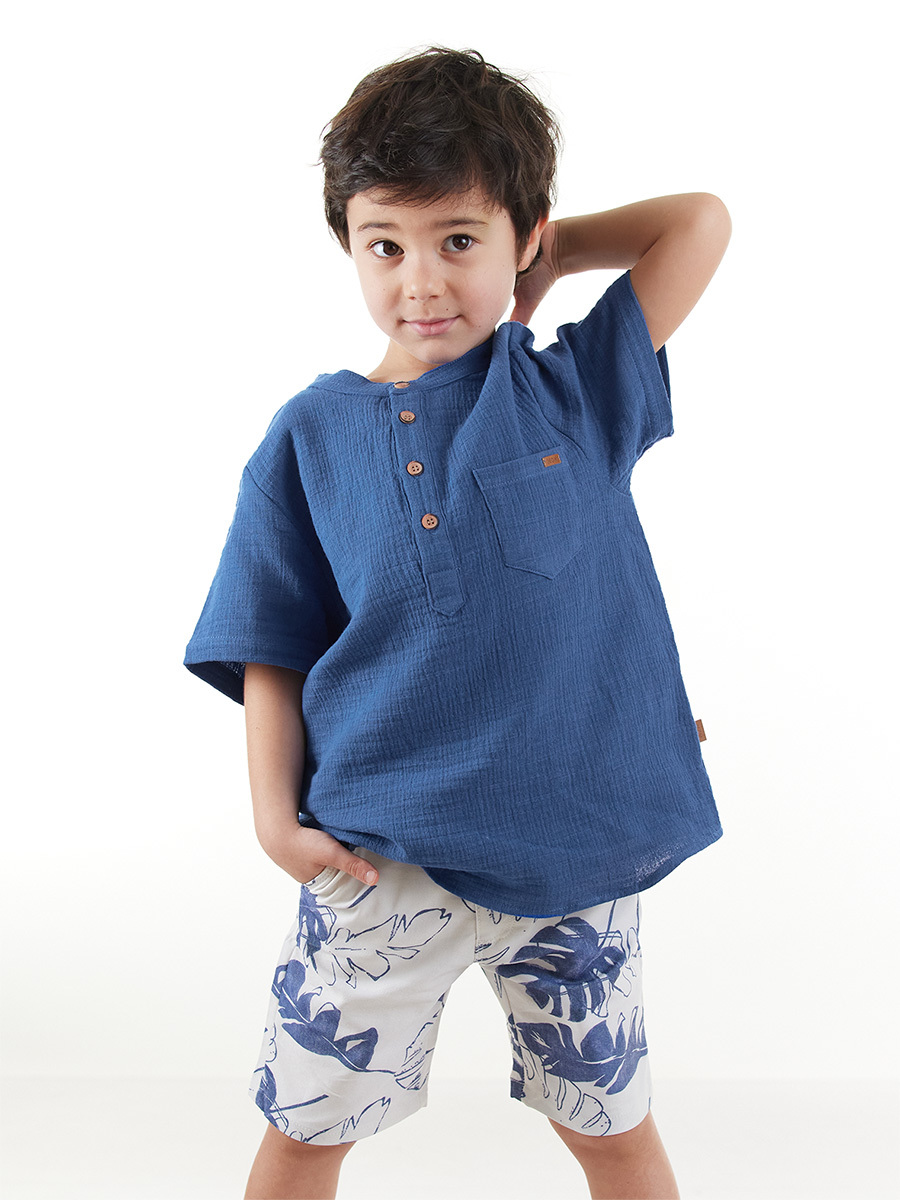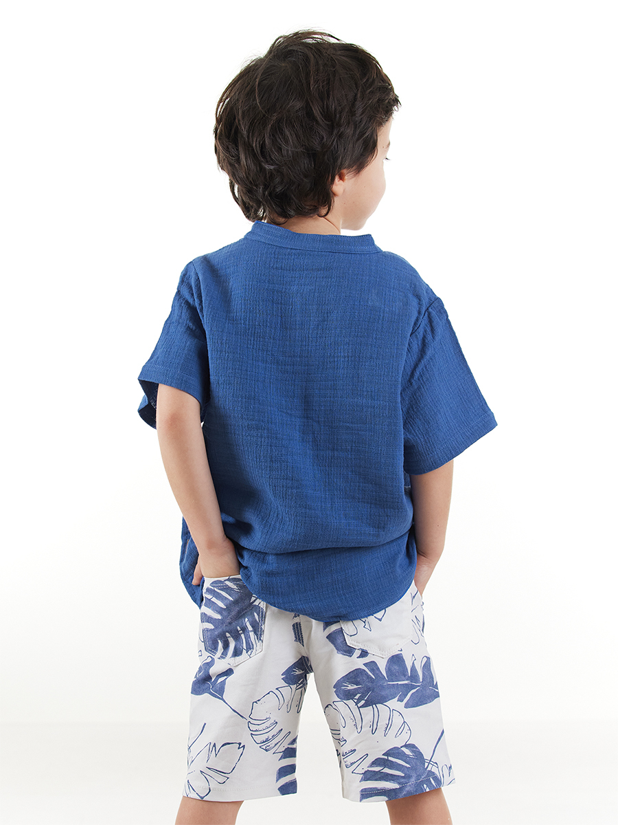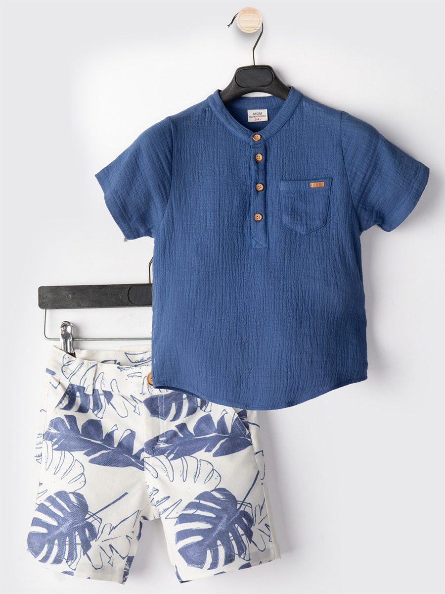 Erkek çocuk takım. Müslin kumaştan cepli, hakim yaka, kısa kol, yarım patlı gömlek. Yaprak desenli gabardin kumaştan 2 yan 2 arka cepli şort. Üst: %100 Pamuk - Alt: % 54 Pamuk %43 Polyester 3% Elastan