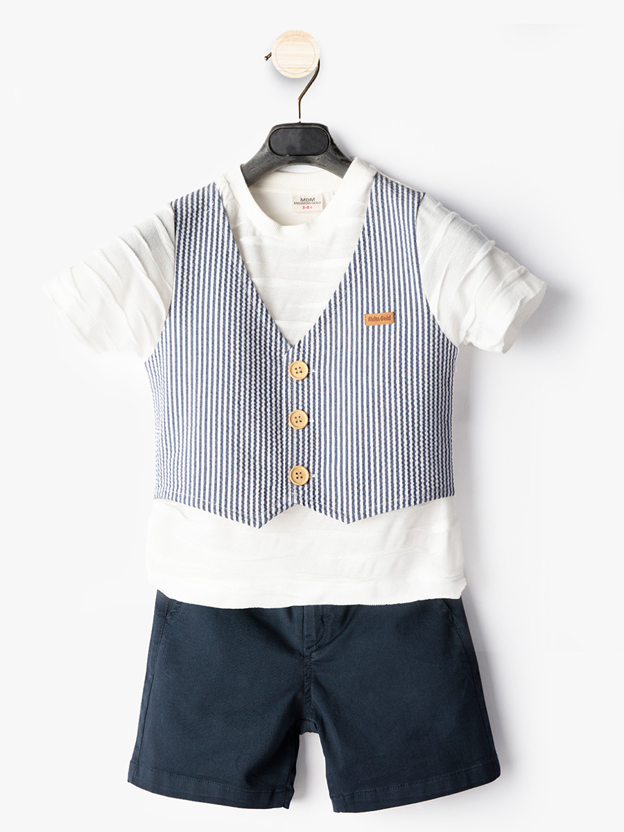 Erkek çocuk takım. Örme kumaştan ön yüzüne yelek dikilmiş, bisiklet yaka, kısa kol t-shirt. Gabardin kumaştan, 2 yan 2 arka cepli şort. Üst: %70 Pamuk %30 Polyester - Alt: %100 Pamuk