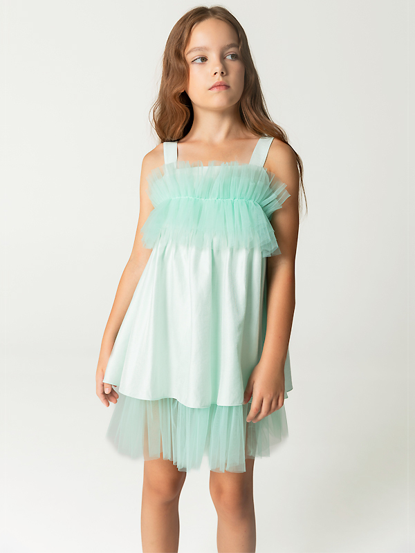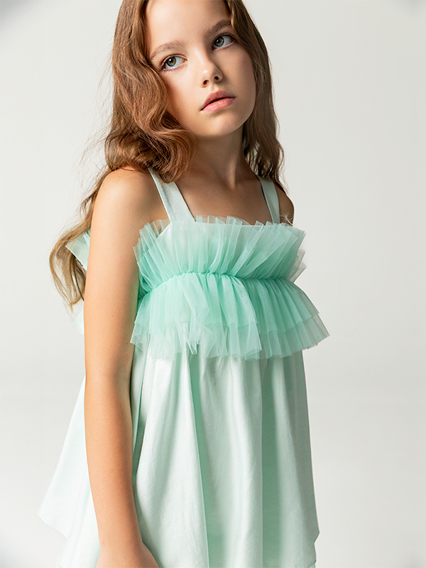 Askılı tasarımı ve göğüs kısmındaki büyük fırfır detayıyla dikkat çeken bu kısa su yeşili parti elbisesi, özel günlerde giyilebilecek şıklıkta bir seçenek sunuyor. Canlı pembe rengi ve fırfırlarıyla genç ve dinamik bir tarz arayanlar için..