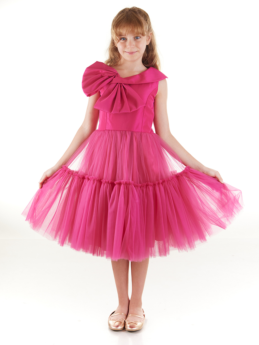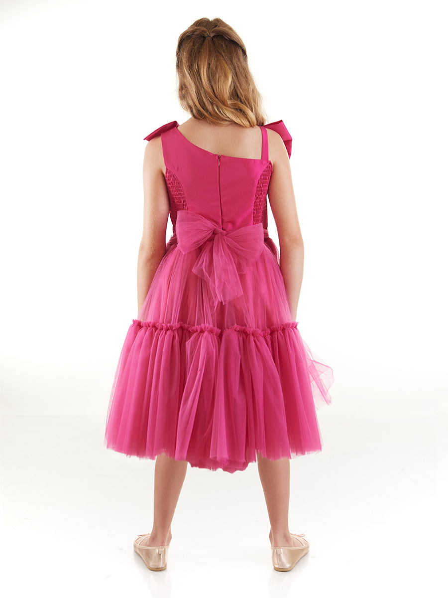 Abiye elbise, fiyonk görünümlü kayık yaka ve fiyonk detayının altında askı bulunan kolsuz bir modeldir. Üst kısmı saten görünümlüdür. Eteği kabarık tüllüdür. Arkasında gipeli lastik sayesinde daha rahat bir kullanım sağlar ve gizli fermuarı sayesinde kolayca giyilip çıkarılabilir. Arka belinde fiyonk detayı bulunmaktadır. Bu elbise, mezuniyetlerde ve düğünlerde kızınızın vazgeçilmezi olacak.