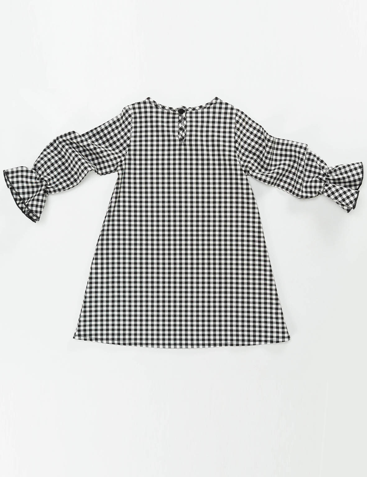 Pötikareli, dokuma kumaştan, omuzdan göğse doğru saten çiçek aplikeli elbise. Elbisenin kolları fırfır detaylıdır. %100 pamuk