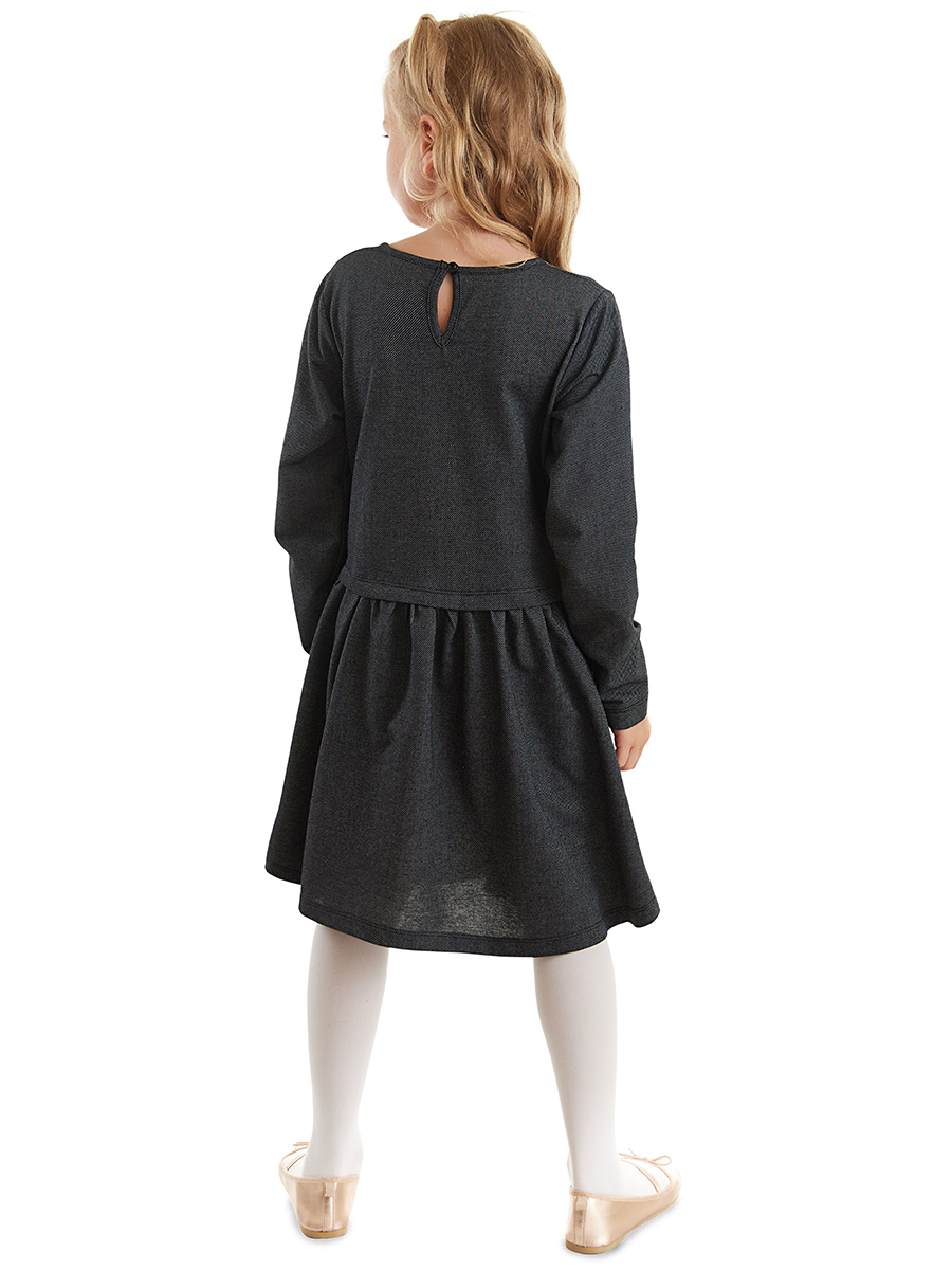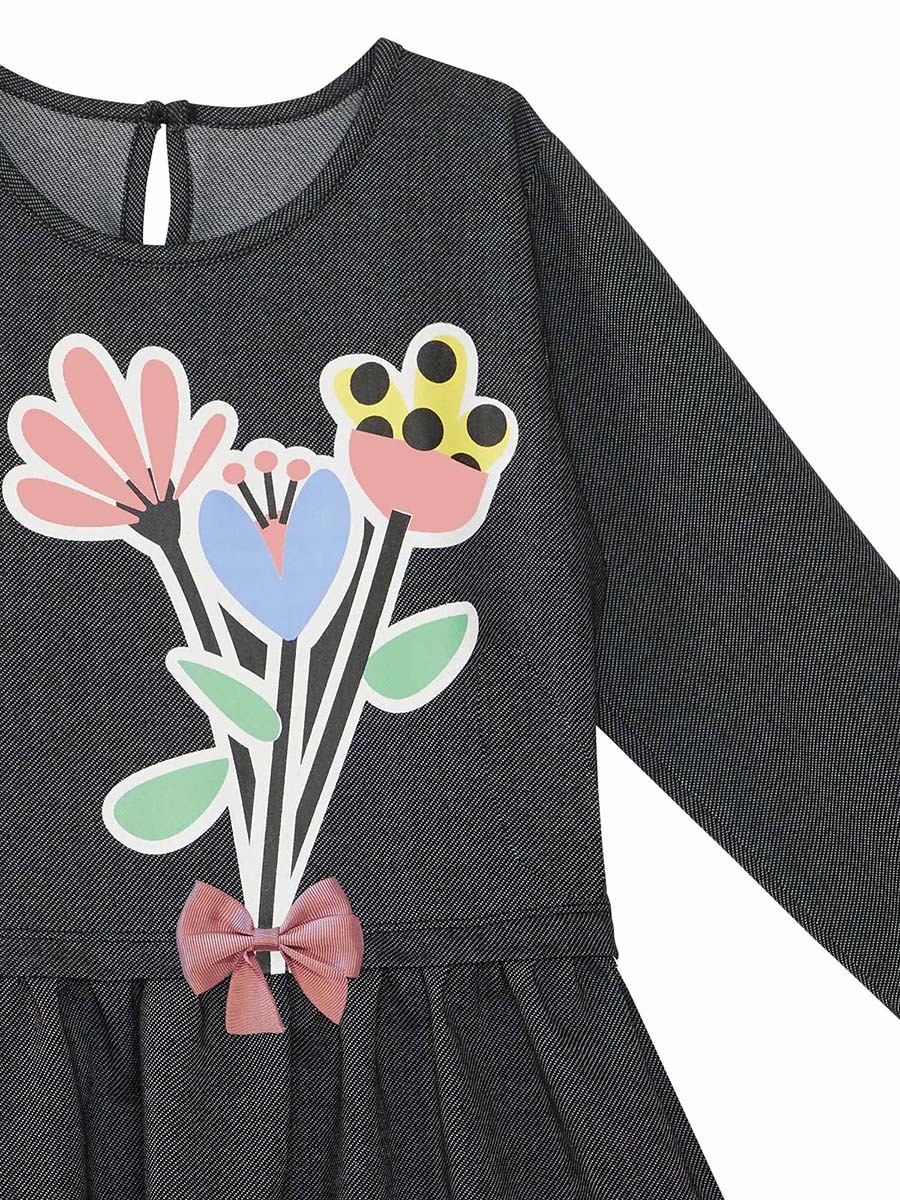 Girl dress with flowers print on. The top of the dress is made of denim-look knitted fabric. All MSHB-G products are produced within kids safety guidelines and dedected by needle dedectors.
