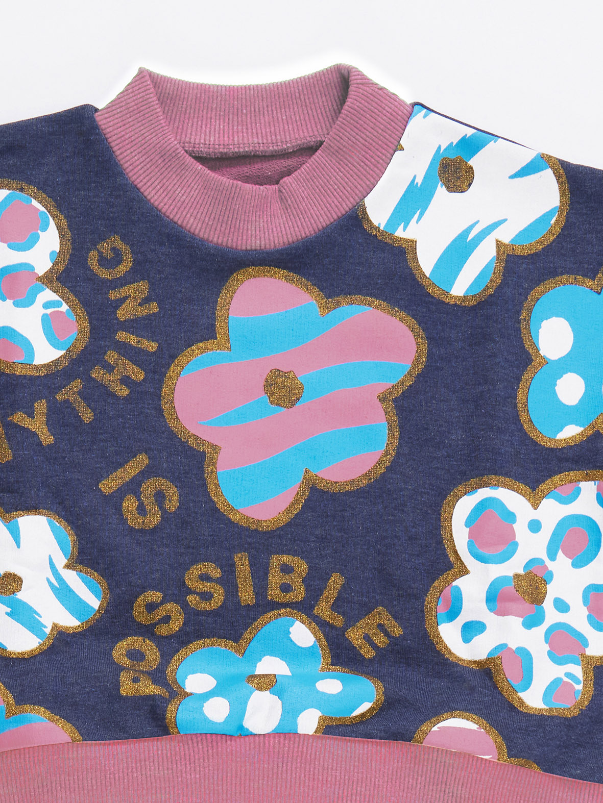2 piece girl tracksuit. Cotton terry, crop-top sweatshirt with flowers print on. Cotton terry pants with elastic bant on waist. Top: %92 Cotton %8 Elastane Bottom: %92 Cotton %8 Elastane