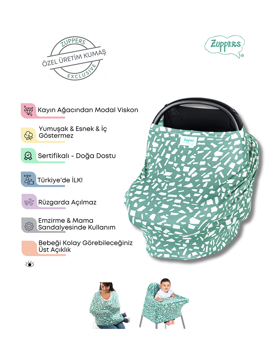 Zuppers; Emzirme Örtüsü, Anakucağı Örtüsü, Puset / Bebek Arabası Örtüsü, Mama Sandalyesi Örtüsü, Market Arabası Örtüsü, Relax ve Sling Battaniyesi ve Anne için Şal olarak kullanılabilir.; Oeko-tex sertifikalı olup, Türkiye'de üretilmiştir.; Kayın ağacı liflerinden elde edilen hava geçiren, yumuşak ve cilde dost 1. kalite viskon kumaş kullanılmıştır.; Emzirme örtüsü olarak anneyi 360 derece sarar, mahremiyet sağlar, terletmez.; Her model ve ebatta anakucağı, bebek arabası, mama sandalyesine uygundur.; Pusete ve anakucağına örtüldüğünde uçuşmaz, yer düşmez, bebeğin uykuya geçmesini kolaylaştırır.; İstenilen şekilde üstten ve alttan açılabilir; bebeğe hava aldırır.; Mama sandalyelerinde tepsi dahil bebeğin temas edeceği yerleri örter, hijyen sağlar.; Standart Beden.; Çamaşır makinesinde benzer renkler ile hassas ayarda 30°’de yıkanabilir.; Tanburlu Kurutma önerilmemektedir.; Türkiye'de tasarlanmış ve üretilmiştir. %95 Viskon %5 Elastan