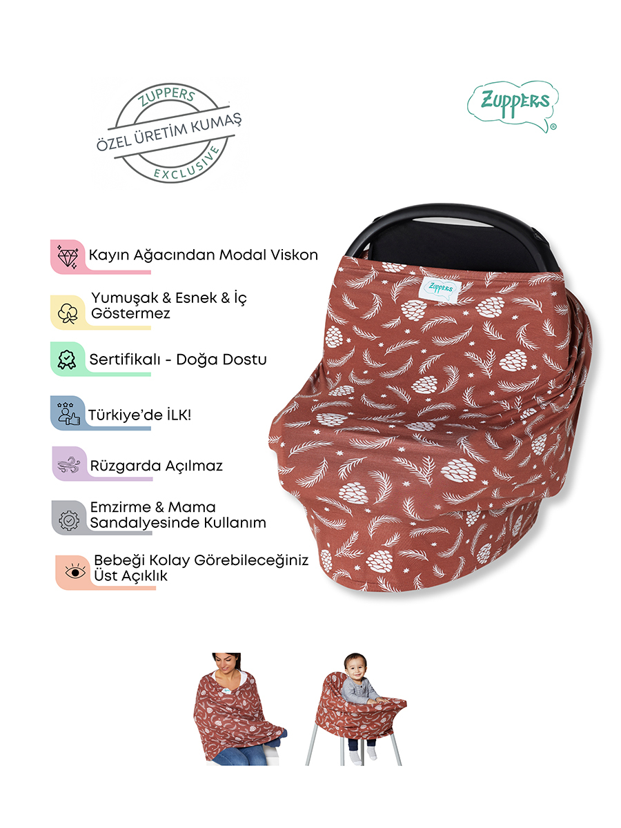 Zuppers; Emzirme Örtüsü, Anakucağı Örtüsü, Puset / Bebek Arabası Örtüsü, Mama Sandalyesi Örtüsü, Market Arabası Örtüsü, Relax ve Sling Battaniyesi ve Anne için Şal olarak kullanılabilir.; Oeko-tex sertifikalı olup, Türkiye'de üretilmiştir.; Kayın ağacı liflerinden elde edilen hava geçiren, yumuşak ve cilde dost 1. kalite viskon kumaş kullanılmıştır.; Emzirme örtüsü olarak anneyi 360 derece sarar, mahremiyet sağlar, terletmez.; Her model ve ebatta anakucağı, bebek arabası, mama sandalyesine uygundur.; Pusete ve anakucağına örtüldüğünde uçuşmaz, yer düşmez, bebeğin uykuya geçmesini kolaylaştırır.; İstenilen şekilde üstten ve alttan açılabilir; bebeğe hava aldırır.; Mama sandalyelerinde tepsi dahil bebeğin temas edeceği yerleri örter, hijyen sağlar.; Standart Beden.; Çamaşır makinesinde benzer renkler ile hassas ayarda 30°’de yıkanabilir.; Tanburlu Kurutma önerilmemektedir.; Türkiye'de tasarlanmış ve üretilmiştir. %95 Viskon %5 Elastan