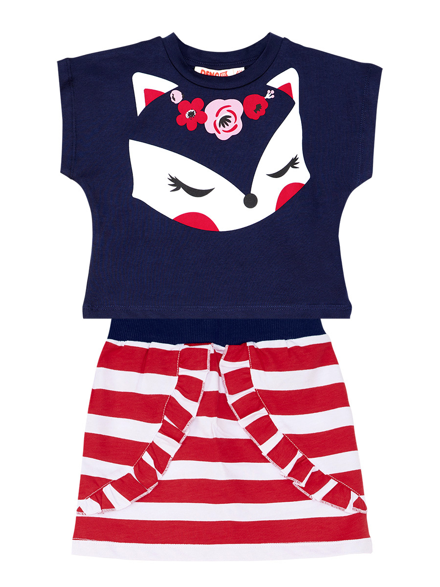 2 parça kız çocuk etek takım. Crop-top kesim üzeri baskılı, pamuklu t-shirt ve beli lastikli, frıfırlı, pamuklu etek. Üst: %95 Pamuk %5 Elastan - Alt: %100 Pamuk