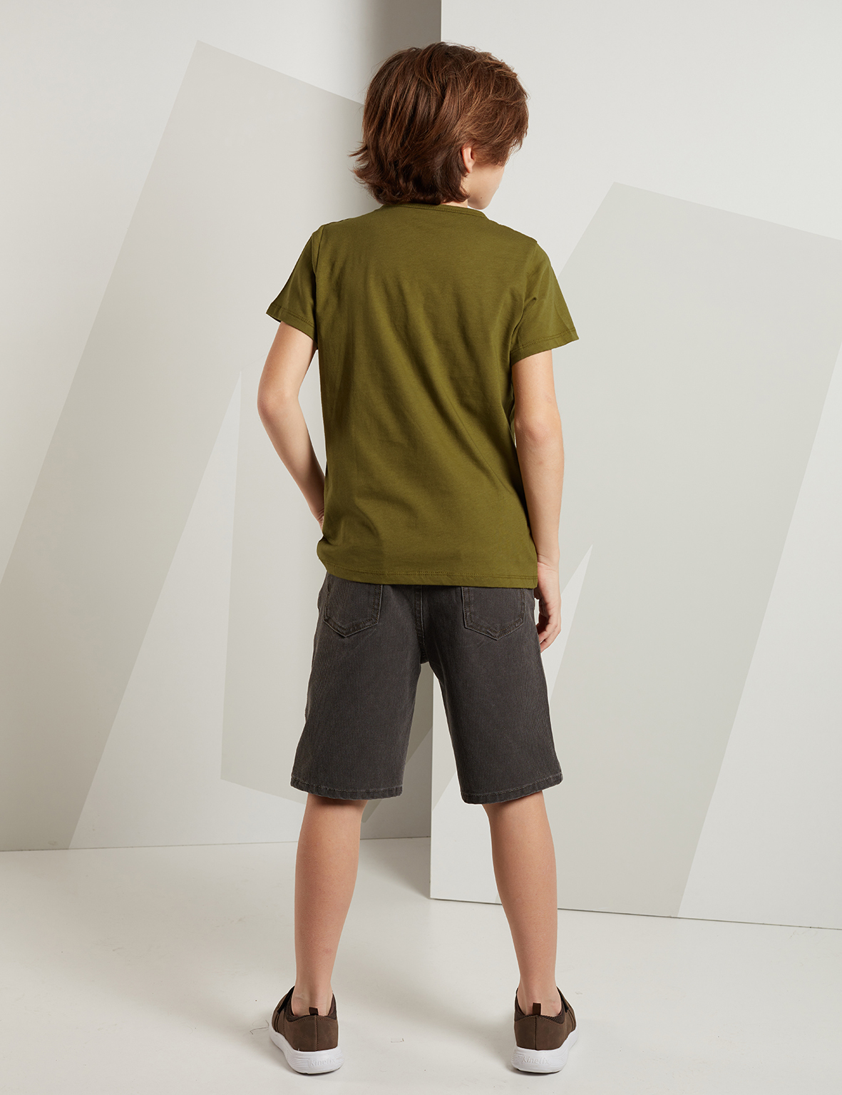 2 parça erkek çocuk takım. Haki yeşil baskılı t-shirt ve gri kot şort. Alt: %96 pamuk %4 elastan, Üst: %92 pamuk %8 elastan
