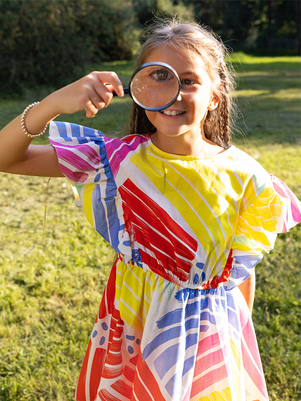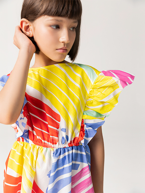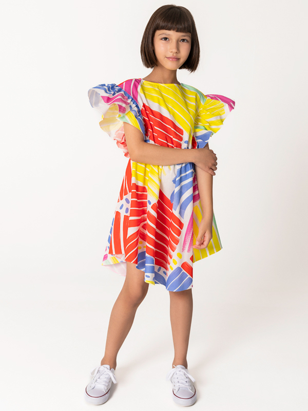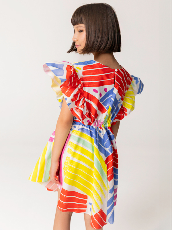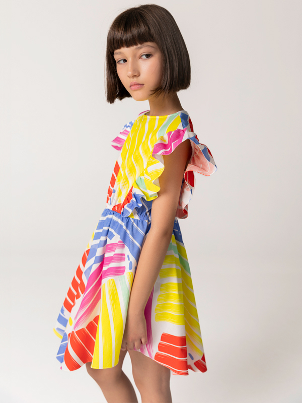 Yüzde yüz pamuklu, grafik desenli ve renkli bu kısa kız çocuk yaz elbisesi, hem rahat hem de eğlenceli bir tasarımsunuyor. Omuzlara doğru uzanan fırfır detayları, hafif bir kol ve omuz kapama sağlarken, ensesindeki düğme ile kolay giyim imkanı sunuyor. Asimetrik kesimiyle modern bir tarz kazanan bu elbise, yazın vazgeçilmez bir parçası olacak