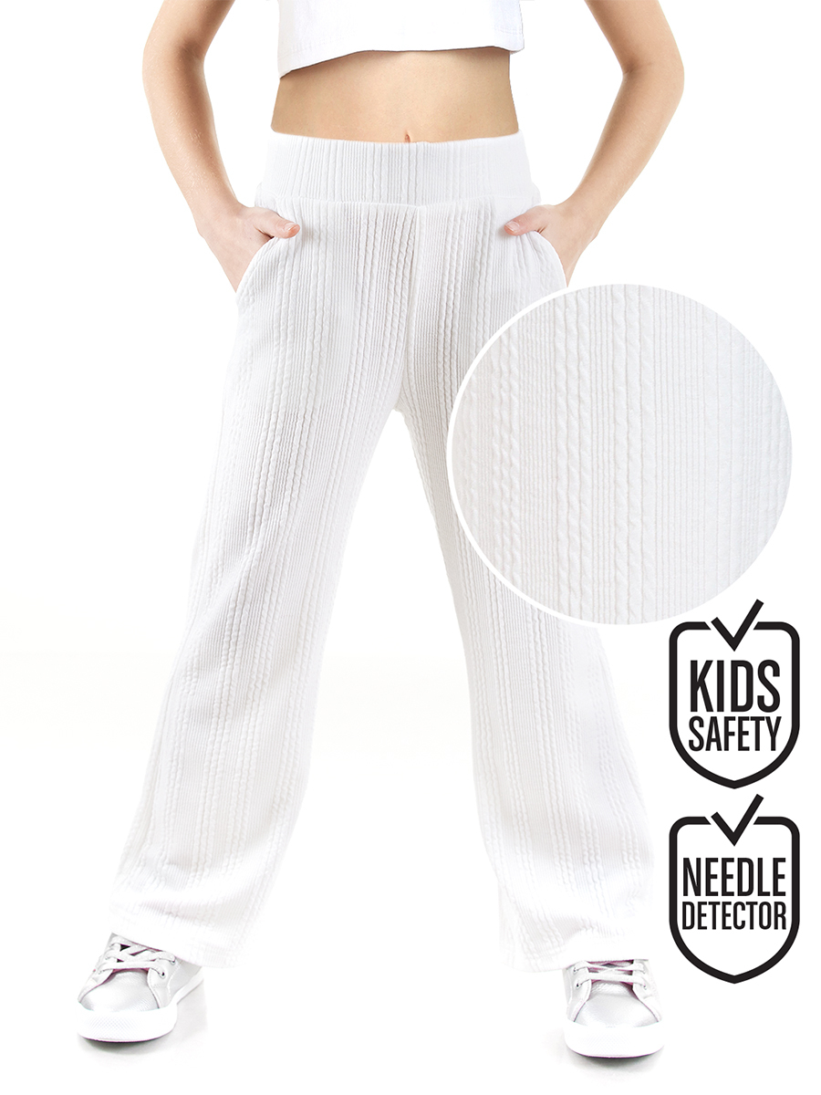 Seasonal knitted trousers made of textured and flexible knitted fabric providing comfort with their flexible structure. Elastic and corded waist. 2 side pockets. Wide legs. All Denokids products are produced in accordance with European stan