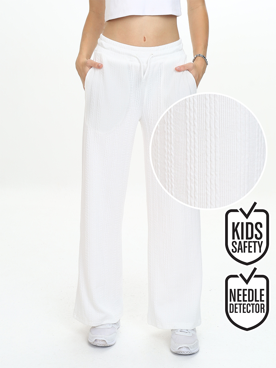 Seasonal knitted trousers made of textured and flexible knitted fabric providing comfort with their flexible structure. Elastic and corded waist. 2 side pockets. Wide legs. All Denokids products are produced in accordance with European stan
