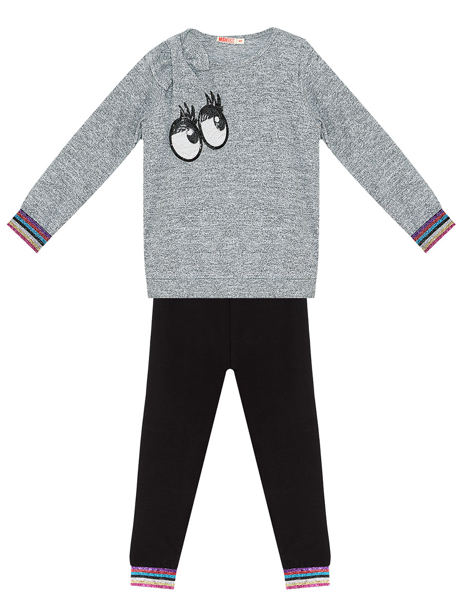 2 piece set. Knitted long sleeve, grey jumper with shiny eyes applique on and its matching black leggings. Bottom;%80 viscose %15 polyester %5 elastane,Top;%50 Cotton %45 polyester %5 elastane