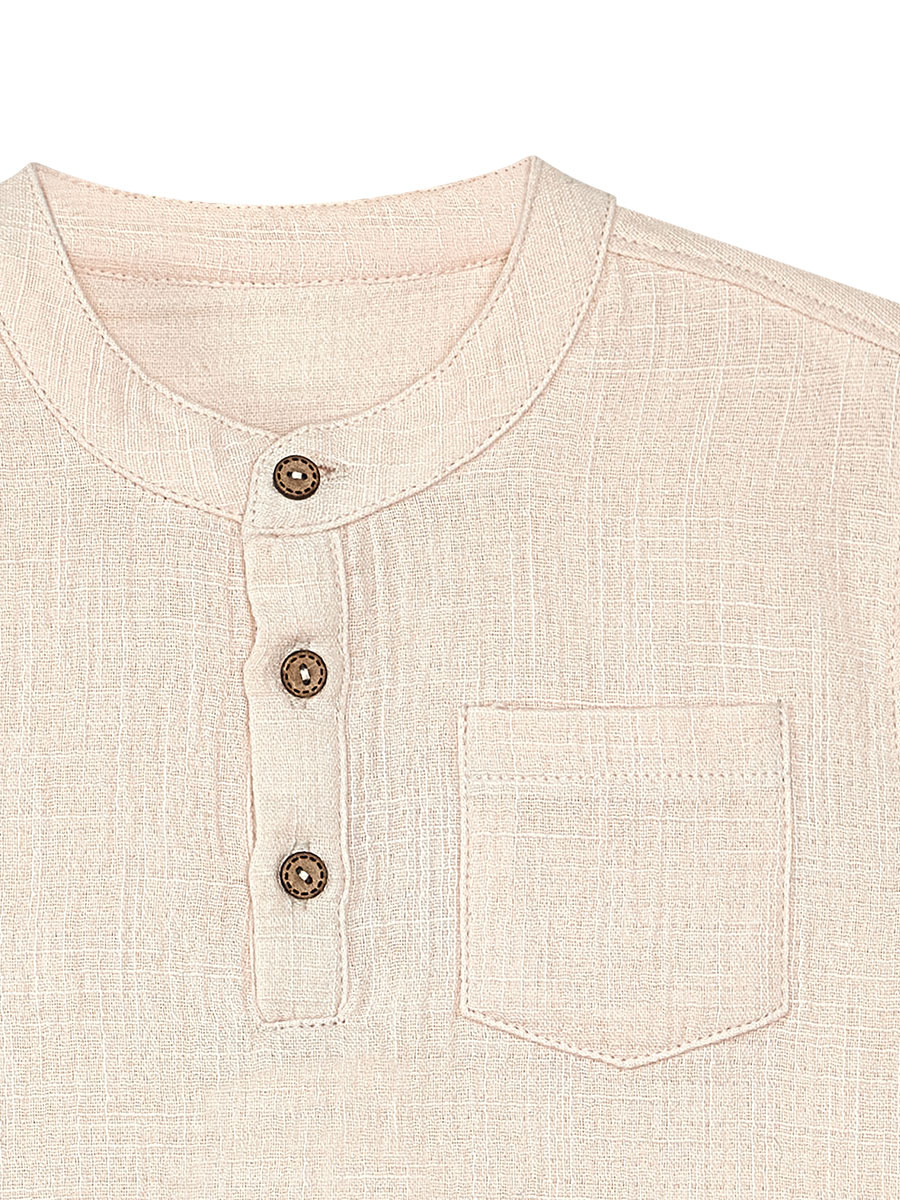 2 piece set. Cream color, muslin shirt. Mandarin colar. Has a front pocket. Navy blue muslin shorts. Has 2, non-functional front buttons. Elasticated waist. All Denokids products are manufactured within the Kids Safety Guideline. Has been i