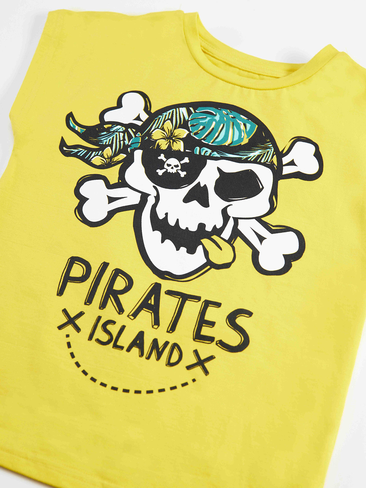 3 piece boy set. Cotton jersey t-shirt with a skull print on. The shorts is made of French Terry and has allover tropical flowers pattern on. Has elastic waist and strings. The set is completed with its matching bandana. All Denokids Produc
