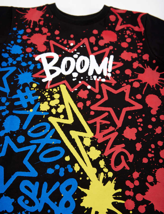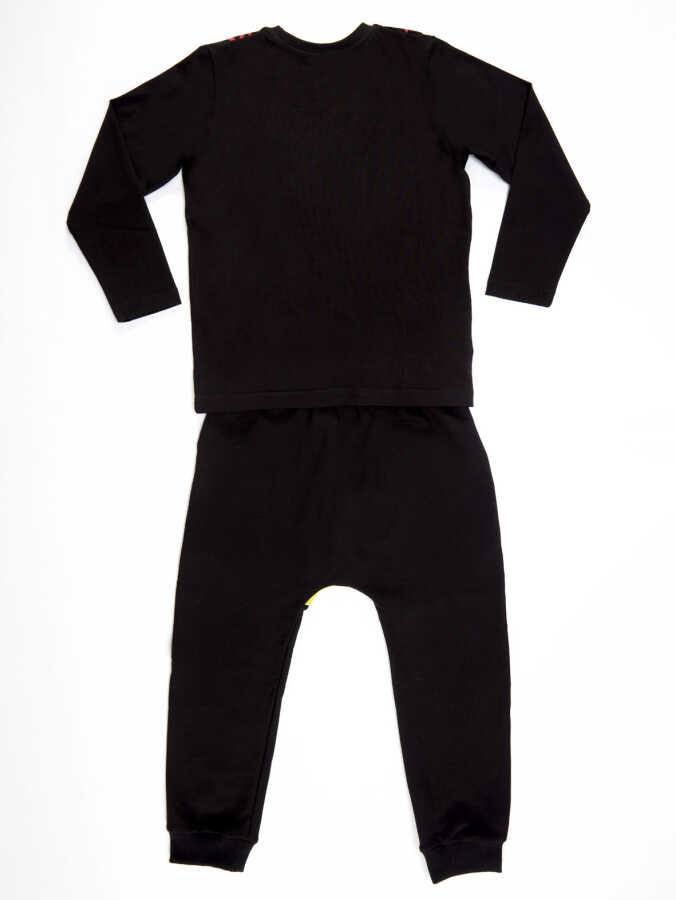 2 piece set. Tee made of cotton jersey. Has a print on. The set is completed with mid-thick cotton, harem style pants. With a yellow verticak stripe on. Top: 92% cotton, 8% elastane. Bottom: 92% cotton, 8% elastane.