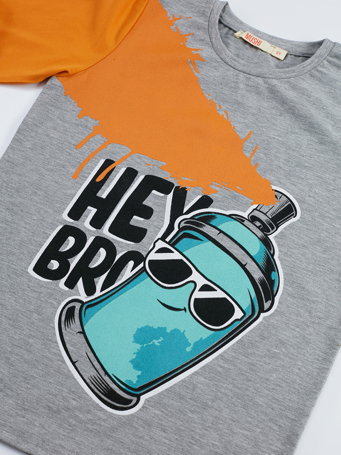 2 piece boy set. Grey, cotton jersey t-shirt with spreying can print on. And baggy style, black cotton pants with pocket detail. top %65 cotton %35 polyester, bottom; %92 cotton %8 elastane