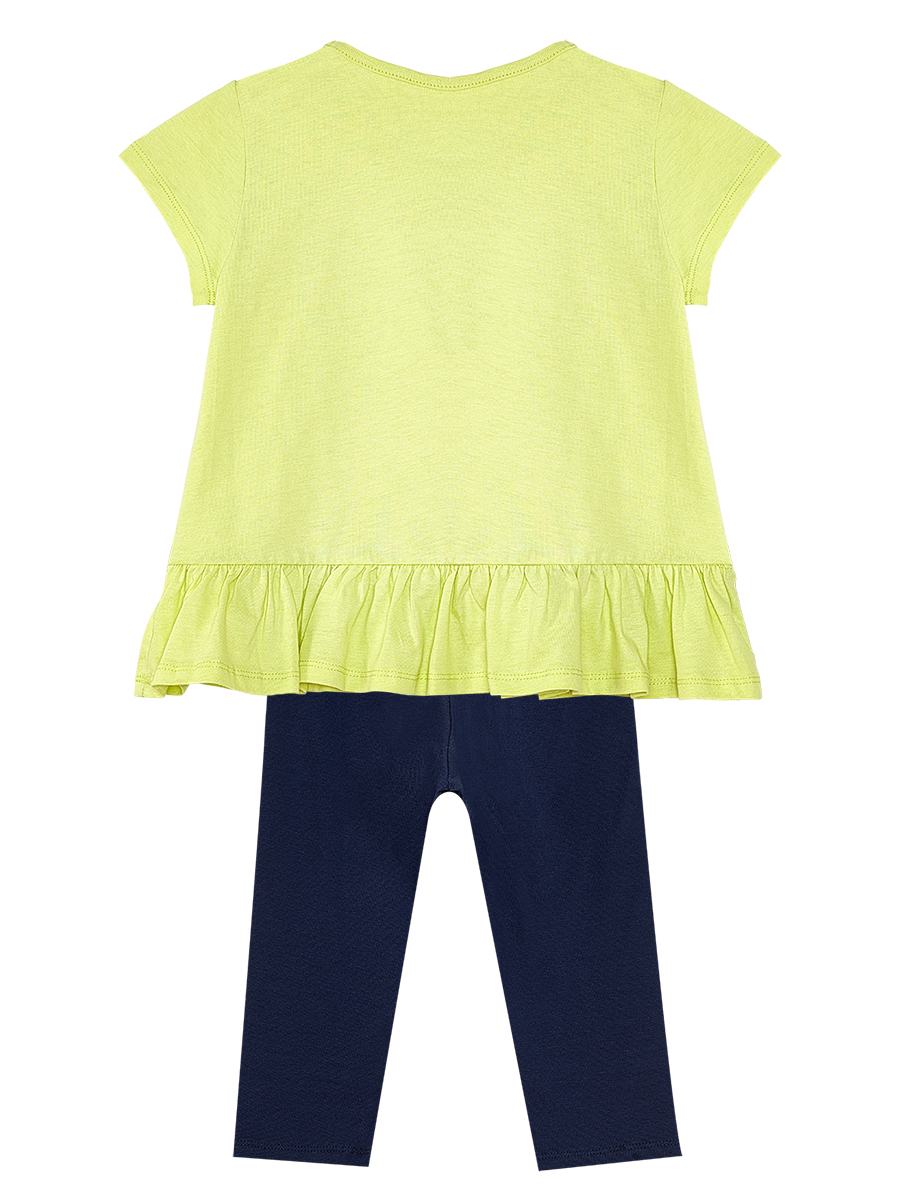 2 piece girl set. Cotton jersey, yellow t-shirt. A hummingbird print on. Cotton jersey, elastic, navy blue leggings. Has flowers print on single side. All MSHB&G products are manufactured within the Kids Safety Guideline. Has been inspected