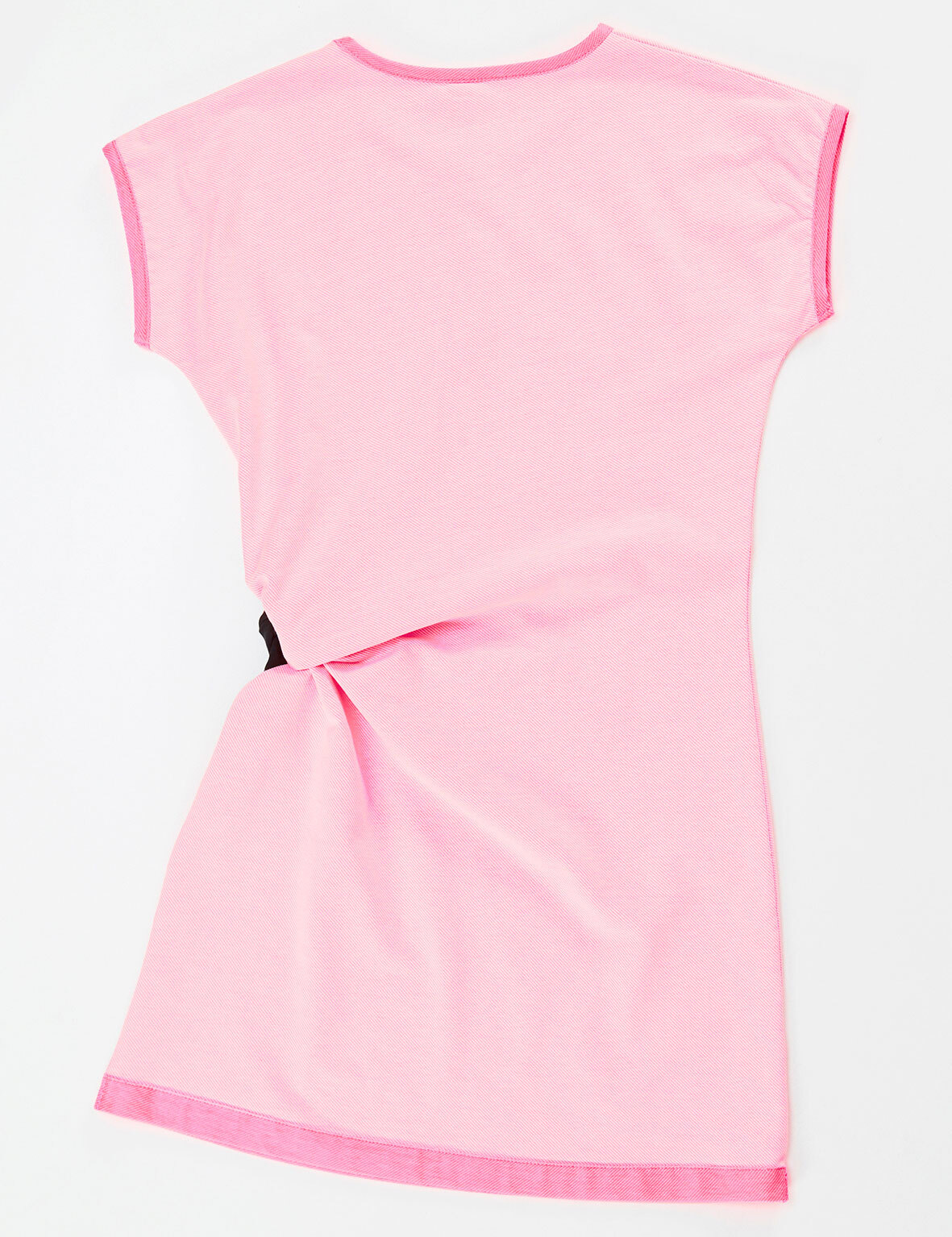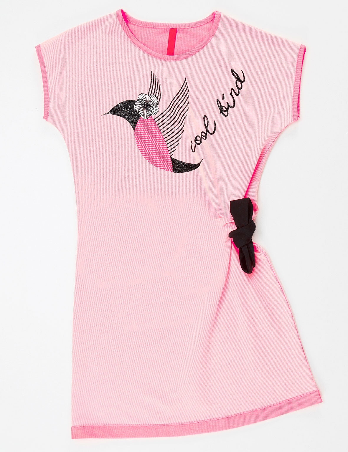Pink dress with print and ribbon knot on side. dress; %65 cotton %35 polyester