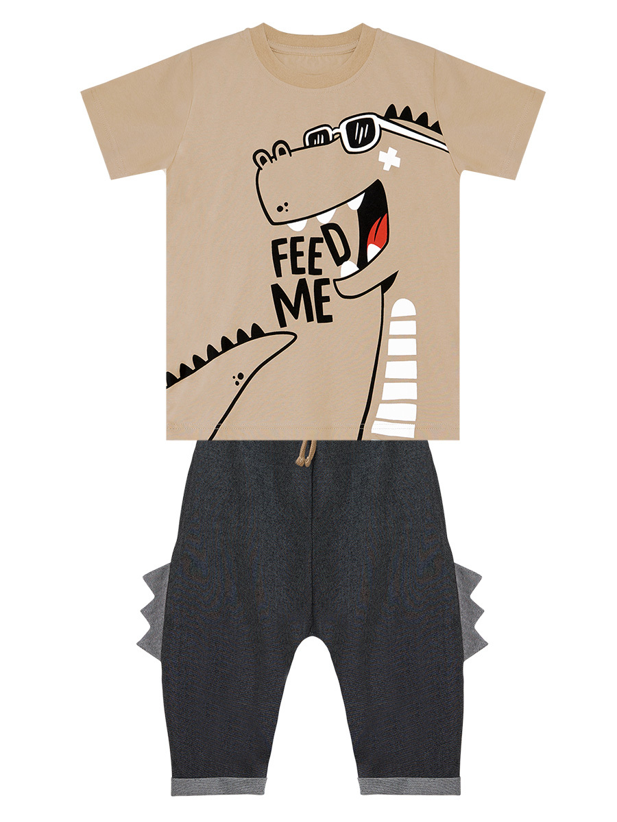 2 piece set. Cotton jersey, beige t-shirt. A funny dinosaur print on. Denim-look, recycled fabric, harem style capri pants. Has 2 side pockets and 3D spikes on sides. Elasticated waistband and strings on. All Denokids products are manufactu