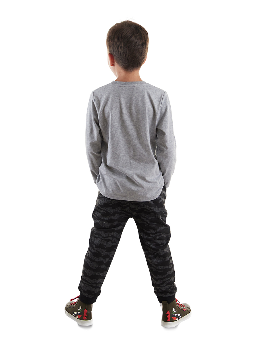 2 parça erkek çocuk pantolon ve t-shirt takım. Uzun, pamuklu penye kumaştan t-shirt. Üzeri baskılıdır. Takımın pantolonu kamuflaj desenli, pamuklu, orta kalın kumaştan, düşük ağ kesimli üretilmiştir. 2 yan ceplidir. Beli lastikli ve kordonludur. Tüm MSHB&G ürünleri çocuk güvenliği düşünülerek üretilmiştir ve iğne dedektörlerinden geçirilmiştir. Üst: %67 Polyester %27 Pamuk %6 Elastan - Alt: %80 Polyester %20 Pamuk