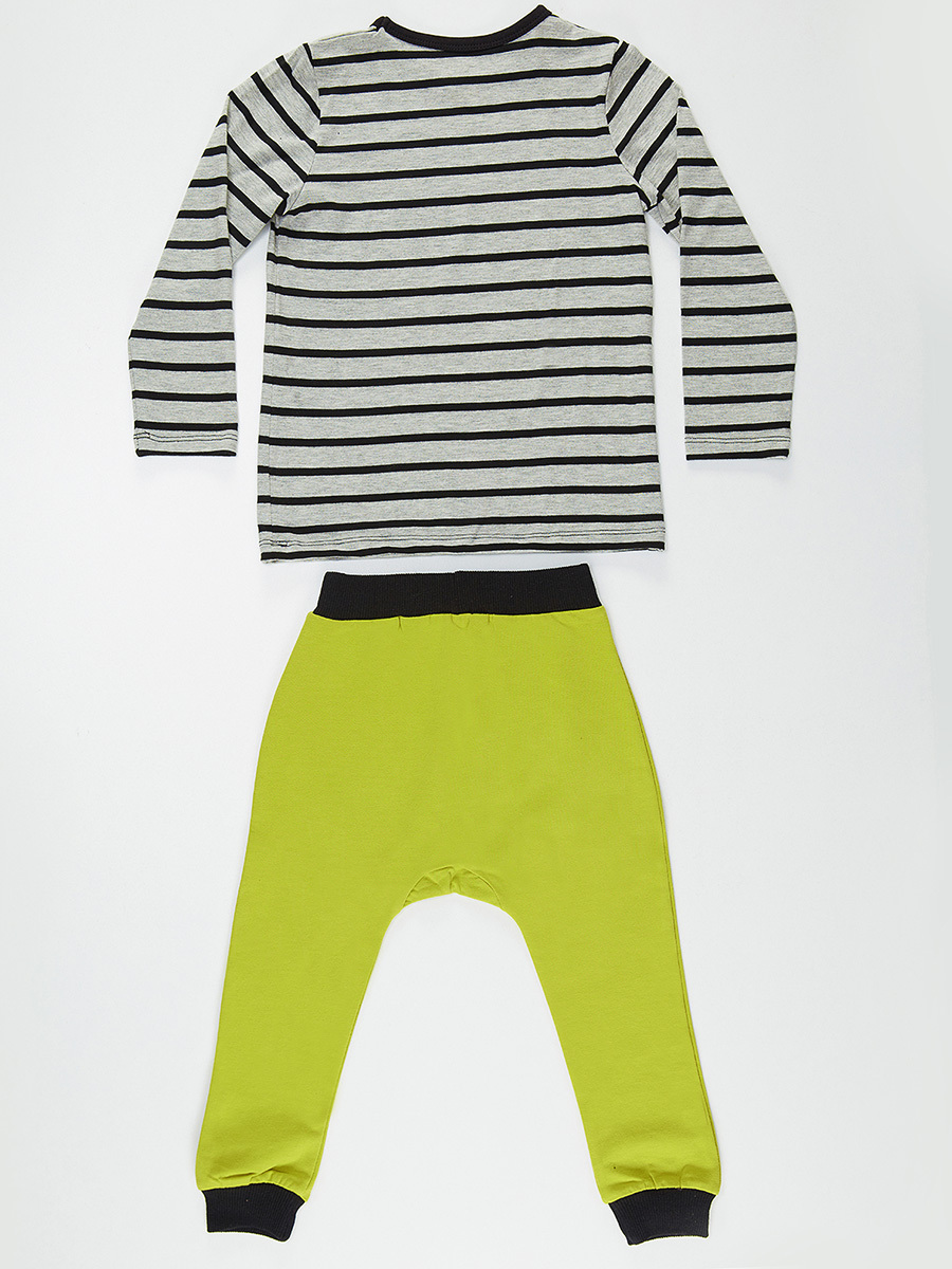 2'li takım. Çizgili ve baskılı t-shirt ve dizi şimşek aplikeli, harem tarzı, düşük ağ pantolon. Üst: %65 Pamuk %30 Polyester %5 Elastan Alt: %92 Pamuk %8 Elastan
