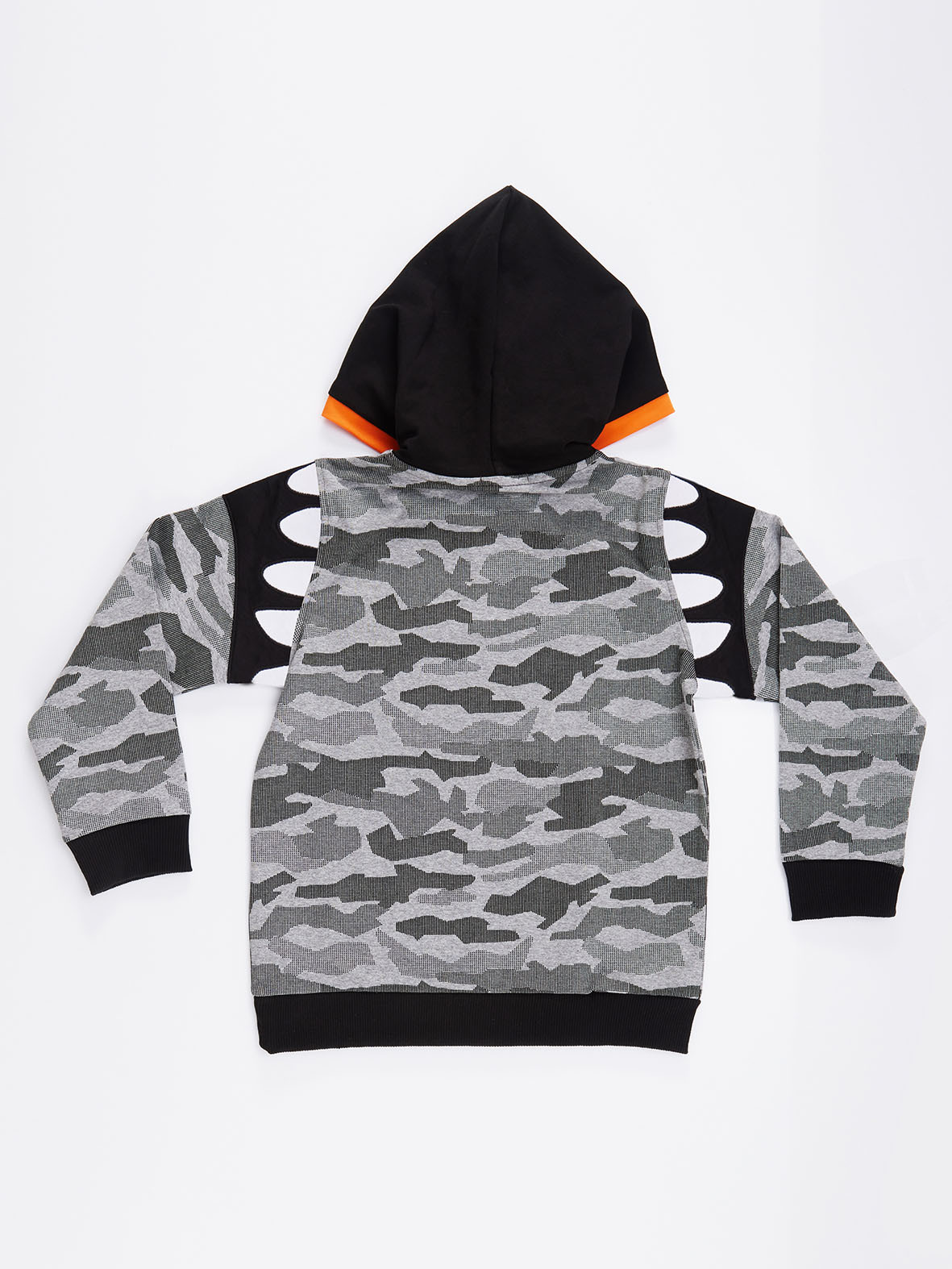 Orta kalın pamuklu kumaştan, kamuflaj desenli, üzeri canavar gözü baskılı, kolları diş aplike detaylı, kapüşonlu sweatshirt. %65 pamuk %35 polyester
