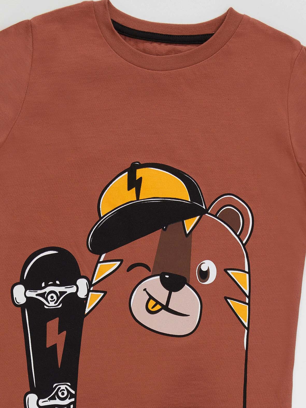 2 parça erkek çocuk t-shirt ve şort takım. Pamuklu penye kumaştan, üzeri baskılı, kısa kol t-shirt. Takımın tamamlayıcısı orta kalın pamuklu penye kumaştan, bir paçası baskılı, beli hem lastikli şort. Bu ürün Avrupa standartlarında "Çocuk Güvenliği Kuralları" gözetilerek üretilmiştir. İğne dedektörlerinden geçirilmiştir.