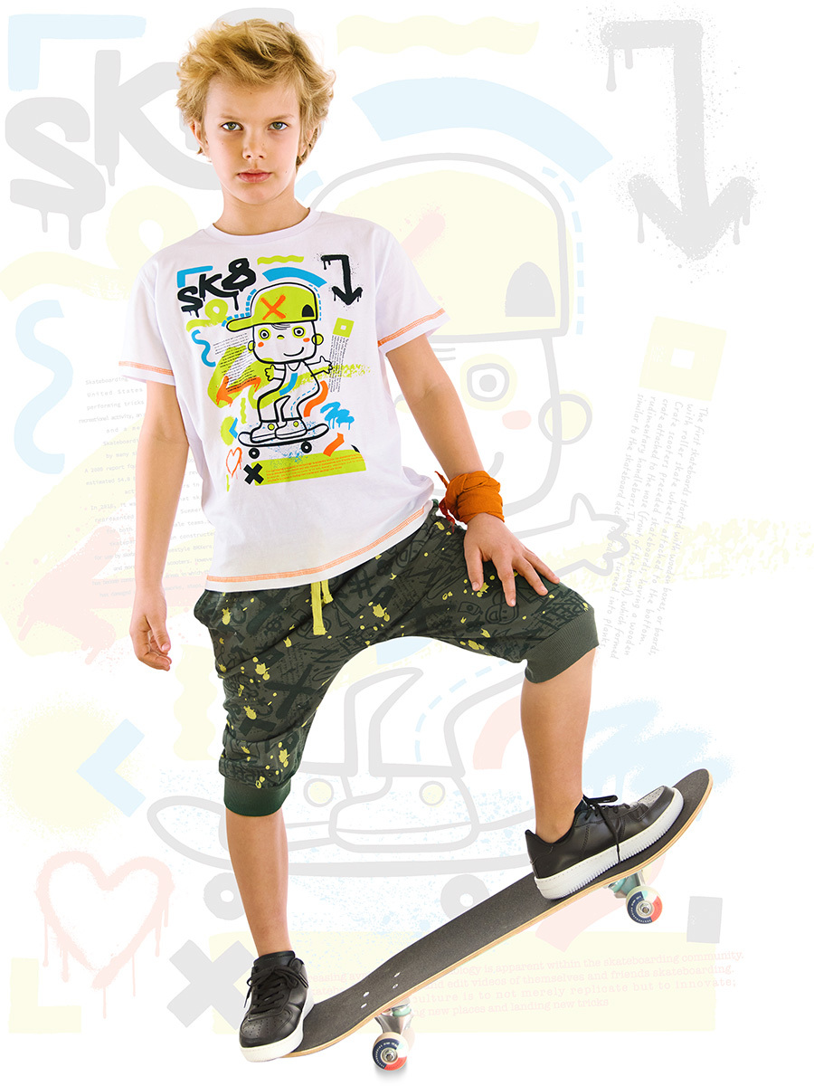 2 parça erkek takım. Pamuklu penye kumaştan, beyaz t-shirt. Üzeri kaykaycı çocuk baskılı. Düşük ağ kesimli, pamuklu kumaştan, grafiti baskılı, kapri boy pantolon. İki yan ceplidir. Beli lastik ve kordonludur. Tüm MSHB&G ürünleri çocuk güvenlik kurallarına uygun olarak üretilmekte ve iğne dedektörlerinden geçmektedir. %100 Pamuk