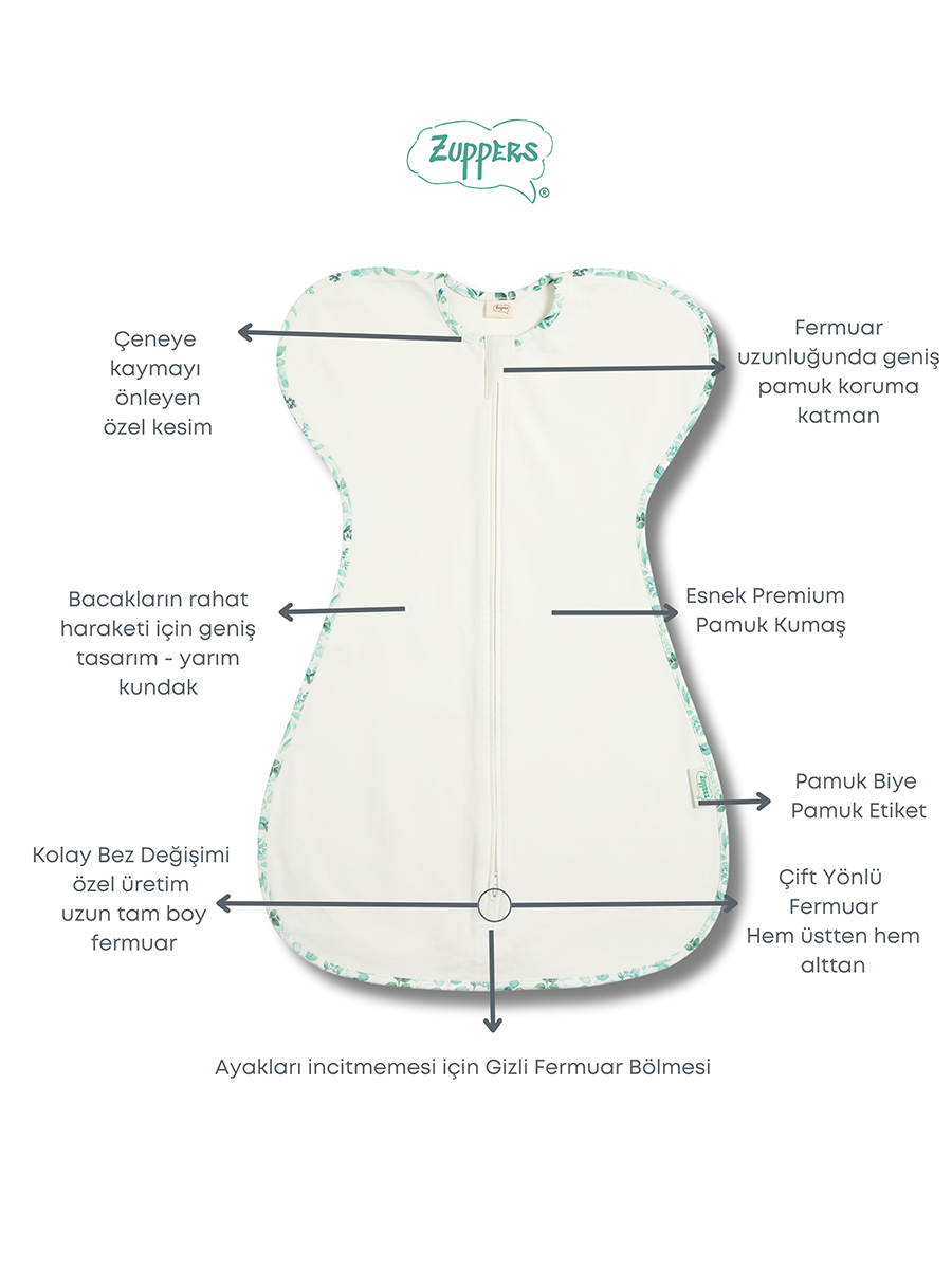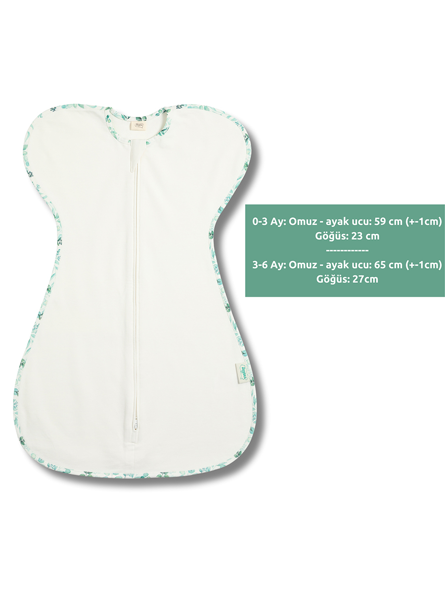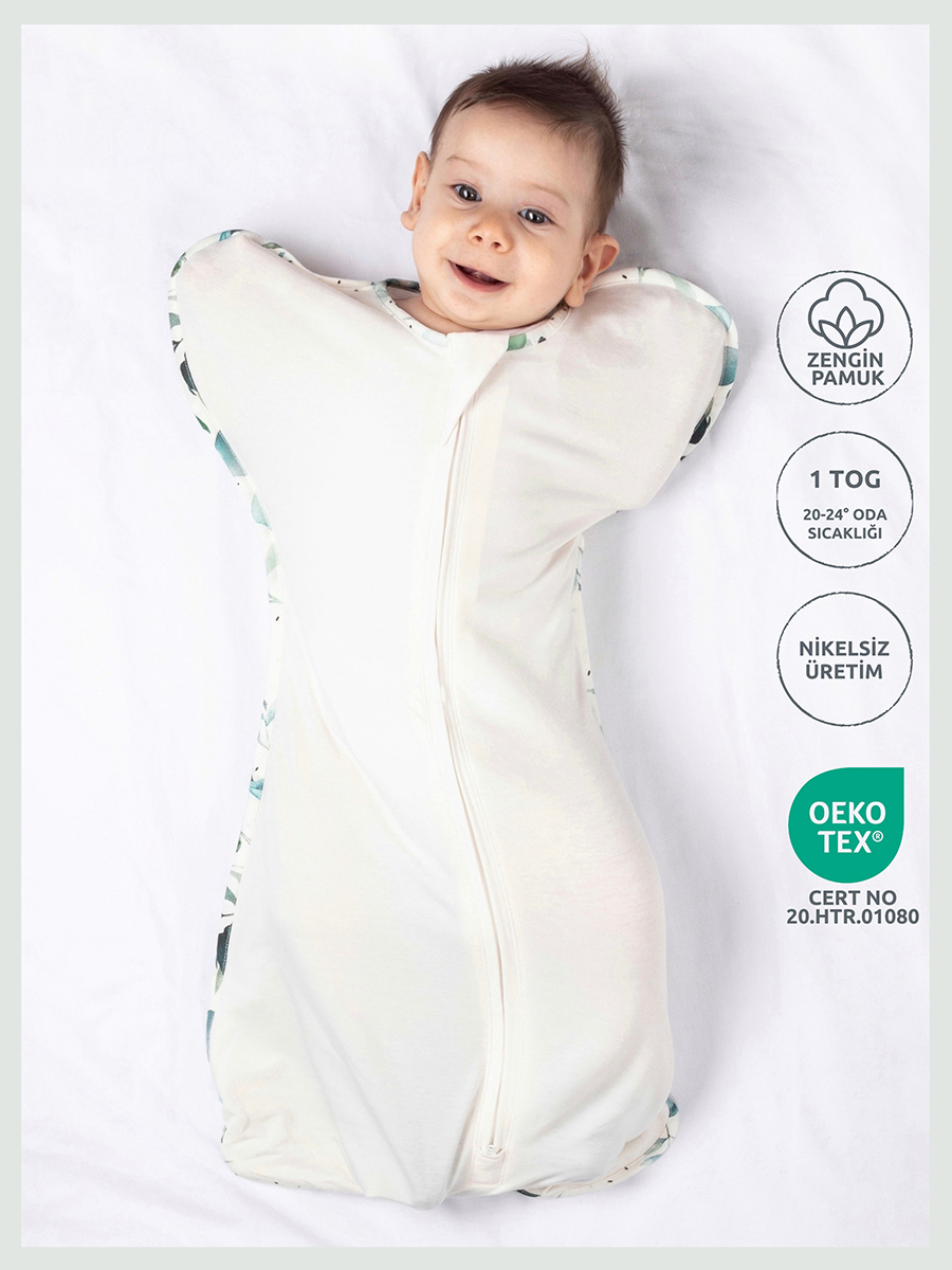 Kollar yukarıda (swaddle up) kelebek şeklindeki ergonomik tasarımı, bebeğin anne karnındaki pozisyona uygundur; Moro refleksine bağlı irkilmeleri etkilerini azaltır.; Bebeğinizin göğsünü sarmalar; sakinleştir ve güven verir.; GOTS sertifikalı organik pamuk kumaşı; hiçbir kimyasal madde içermez.; Bebeğinizi saniyeler içinde kundaklayabilirsiniz.; Hem alttan hem üstten açılan çift yönlü fermuarı kolayca bez değiştirmenizi sağlar.; Her iki tarafa da esneyen kumaşı ile bebeğinizin hareketlerini kısıtlamaz.; Kese şeklindeki tasarımı ile kalça çıkığını engeller ve bacakların rahat hareket etmesini sağlar.; Doğal kumaşı sayesinde 1 tog değerine uyumlu oda sıcaklığında bebeğin vücut sıcaklığını sabit tutar, üşümesini ve terlelemesini engeller.; Battaniye olmadan bebeğinize güvenli ve konforlu bir uyku sunar.; Fermuar başlangıç ve bitiş noktalarının bebeğinizin tenini incitmemesi için fermuar korumaları tasarlanmıştır.; Uyku Tulumu Tog Değerleri: 1 Tog uyku tulumunu 20-22 derece oda sıcaklığında bebeğinizi kolsuz zıbın, uzun kollu pijama ve alt pijama ile ; 22-24 derece oda sıcaklığında uzun kollu body/üst pijama ve alt pijama ile, 24 derece oda sıcaklığında sadece yarım kollu body/zıbın ile giydirebilirsiniz.; Tog değeri oda sıcaklığına bağlıdır, ve kumaşın ısı geçirgenliğini belirtir.; 0-3 ay omuzdan ayağa ürün uzunluğu: 59 cm – Göğüs: 23 cm Kilo: 3-6 Kg 3-6 ay omuzdan ayağa ürün uzunluğu: 65 cm – Göğüs: 27 cm Kilo: 6-9 Kg Benzer renkler ile maksimum 40° sıcaklıkta yıkamanızı öneririz.; Asarak veya sererek kurutabilirsiniz.; Organik pamuk kumaşlarda tamburlu kurutma yapmayınız.; Ürün doğal içerikli organik pamuk ipliğinden üretildiğinden yıkama ve kullanım kaynaklı renk değişiklikleri görülebilir.; (Yumuşatıcı ile yıkama, bebek yağı kullanımı, yüksek sıcaklıkta yıkama vb.; ) %95 Pamuk %5 Elasten Türkiye’de üretilmiştir.