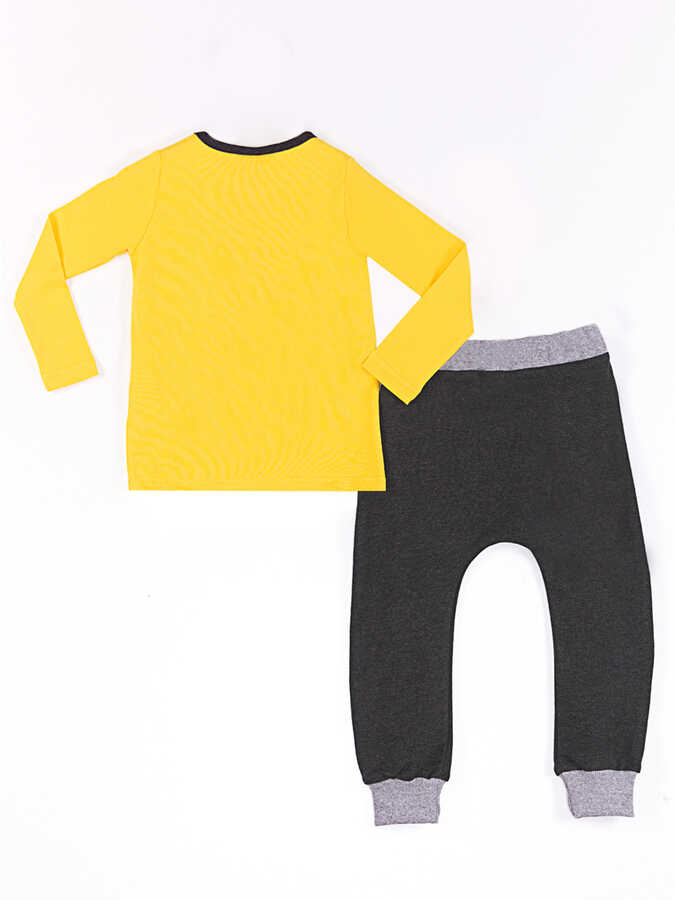 2 parça takım. Pamuklu penye kumaştan, uzun kollu, üzeri komik yüz aplikeli t-shirt. Takımın tamamlayıcısı düşük ağ kesimli, orta kalın, pamuklu, üzeri aplikeli, verev cep detaylı pantolon. Alt: %92 pamuk %8 elastan, top%92 pamuk %8 elastan
