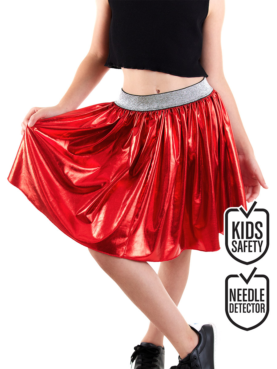 Kız çocuk parlak metalik kırmızı etek. Beli simli ve lastiklidir. Varaklı kumaştan üretilmiştir. Tüm Denokids ürünleri çocuk güvenliği düşünülerek üretilmiştir ve iğne dedektörlerinden geçirilmiştir. %95 Polyester %5 Elastan