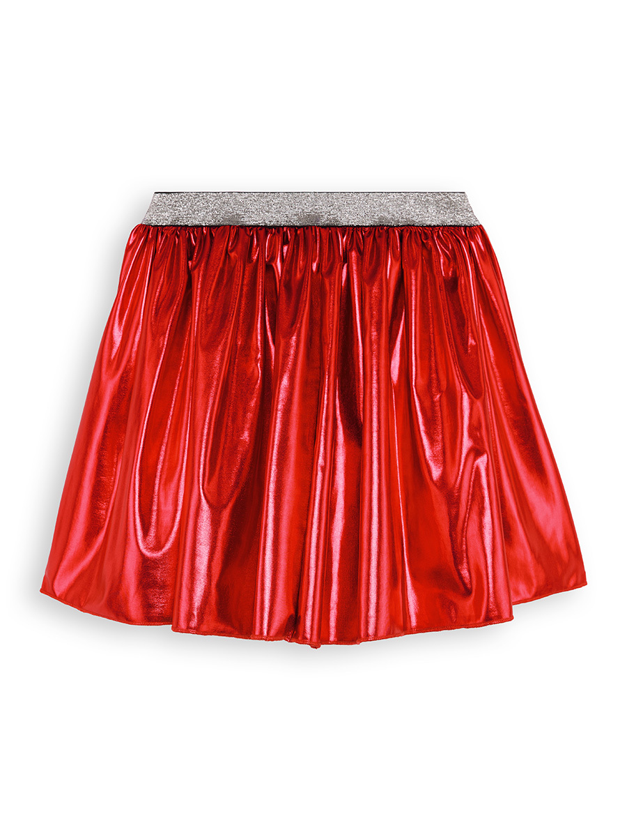Kız çocuk parlak metalik kırmızı etek. Beli simli ve lastiklidir. Varaklı kumaştan üretilmiştir. Tüm Denokids ürünleri çocuk güvenliği düşünülerek üretilmiştir ve iğne dedektörlerinden geçirilmiştir.