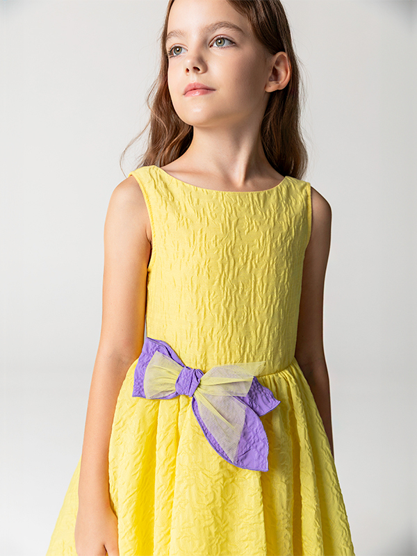 Elbisenin parlak sarı rengi, enerji dolu ve mutluluk veren bir güneşi anımsatıyor. Mor fiyonk detayı ise zarif bir dokunuş katıyor, bu yüzden isim hem enerjik hem de şık bir hissiyat yaratır. %63 PAMUK %37 NYLON, ASTAR %100 PAMUK