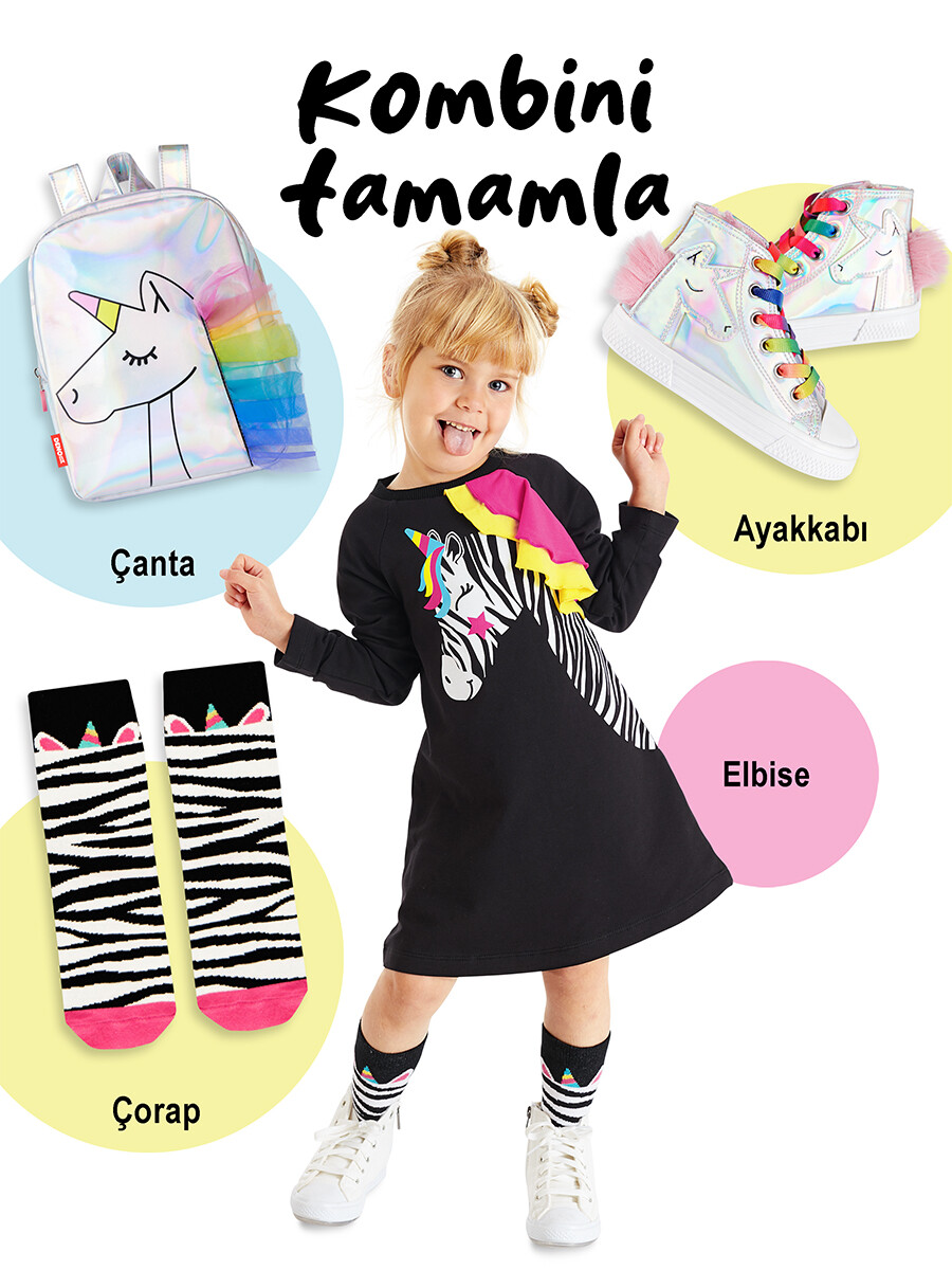 Siyah Unicorn Zebra Kız Çocuk Uzun Kollu Fırfır Detaylı Elbise