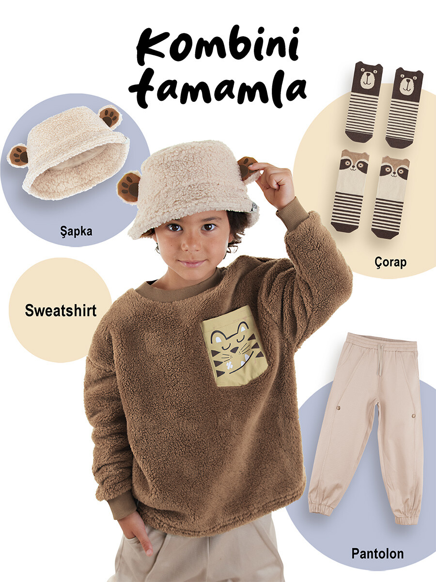 Kaplan Oversize Erkek Çocuk Kahverengi Peluş Sweatshirt