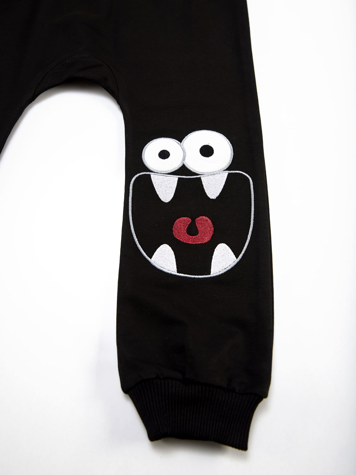2 parça erkek çocuk sweat-pantolon ve t-shirt takım. Pamuklu penye kumaştan, uzun kollu, canavar baskılı t-shirt. Ve takımın tamamlayıcısı orta kalın, pamuklu kumşatan düşük ağ kesimli, rahat sweat-pantolon. Pantolonun bir paçası komik surat aplikelidir. Beli lastikli ve kordonludur.